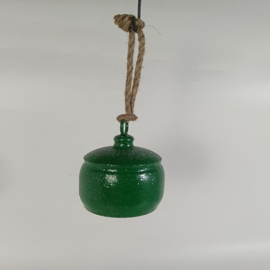 Campana decorativa de metal en color verde con un brillante acabado diamantado. Es ideal para añadir un toque de lujo y festividad a tu decoración navideña. Material: metal. Medidas: 9.5×9.5x14cm.