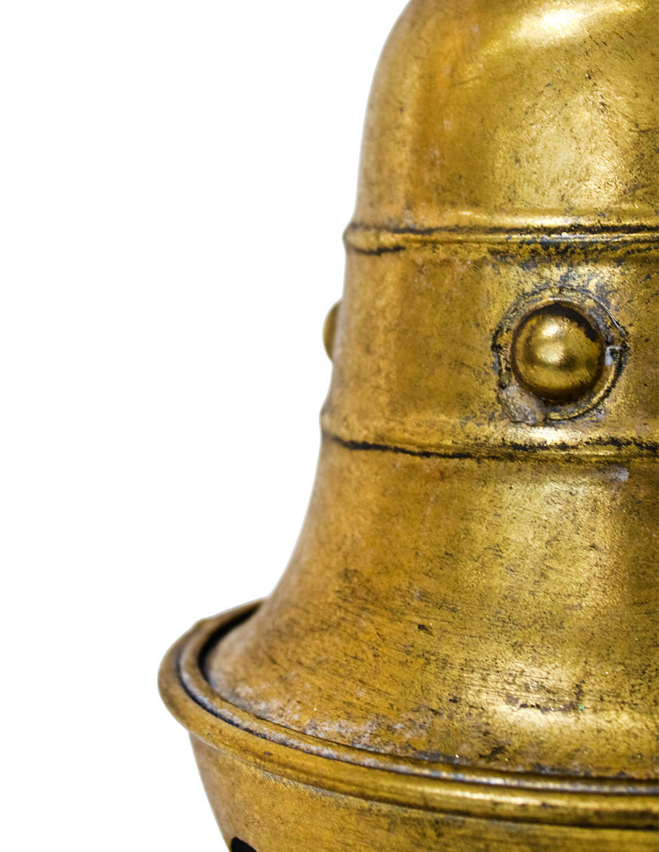 Imponente campana de metal con un acabado dorado vintage y un cascabel colgante. Medidas: 20.5 x 33 cm. Su gran tamaño y color lujoso son perfectos para añadir opulencia, distinción y un encanto atemporal.
