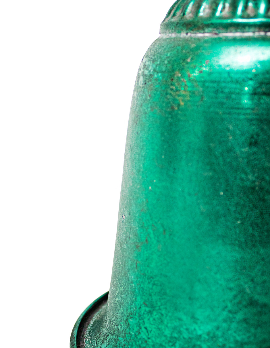 Clásica campana de metal con un acabado verde vintage y un adorno de lazo en la parte superior. Medidas: 24.5 x 31 cm. Su gran tamaño es perfecto para añadir un toque rústico y elegante con un aire de historia a tu decoración.