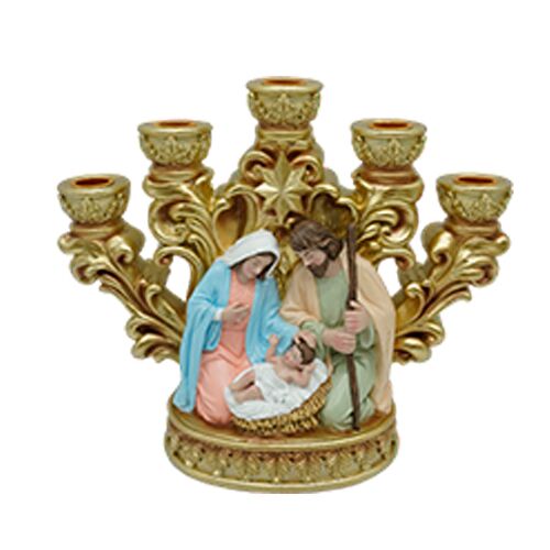 Un toque de fe y elegancia para tu decoración navideña. Este candelabro con la figura de la Sagrada Familia es la pieza perfecta para decorar tu hogar en la temporada festiva. Con capacidad para 5 velas, es ideal para crear un ambiente de paz y calidez.