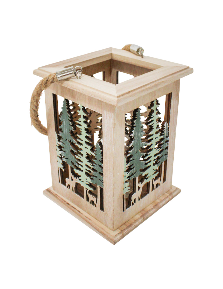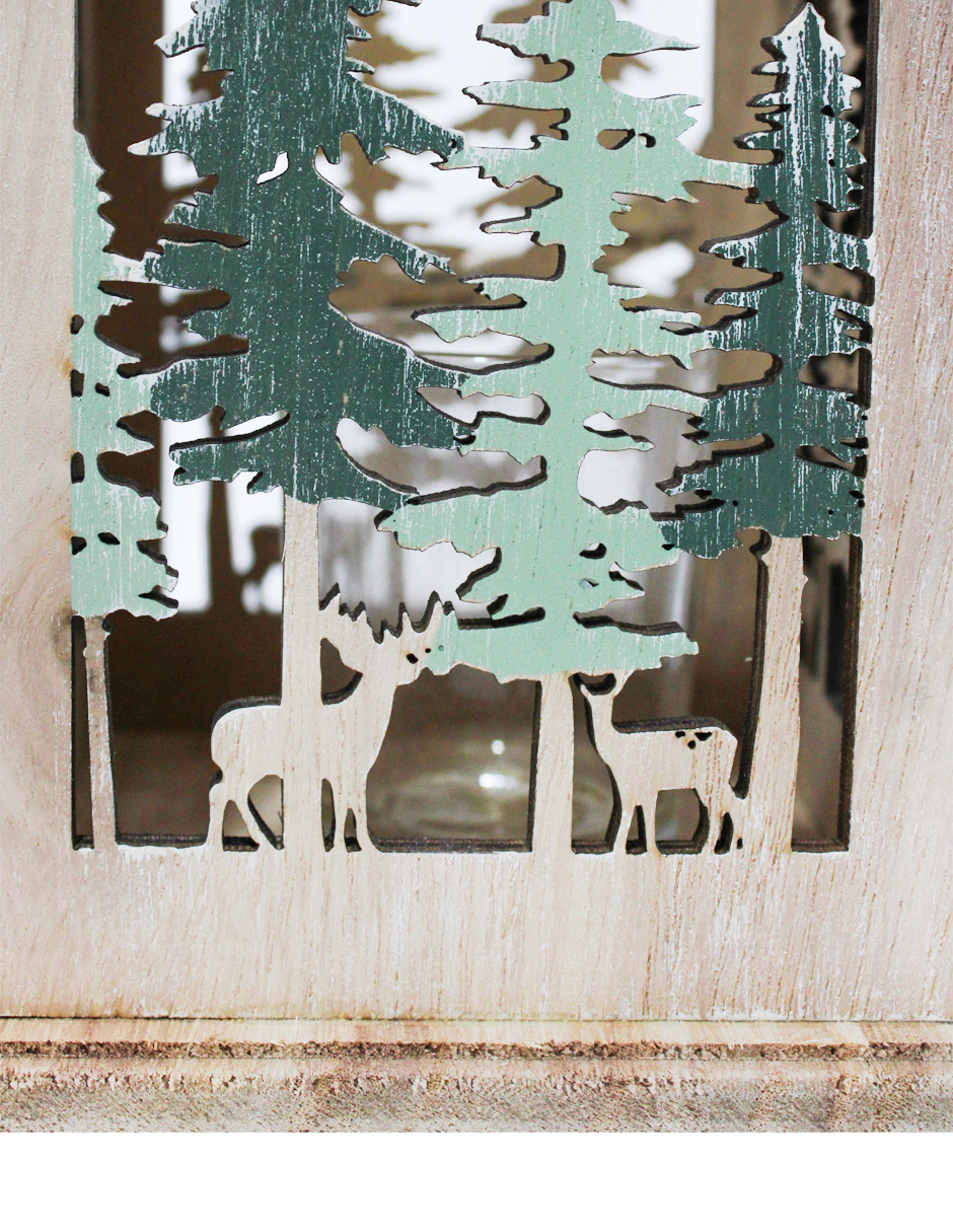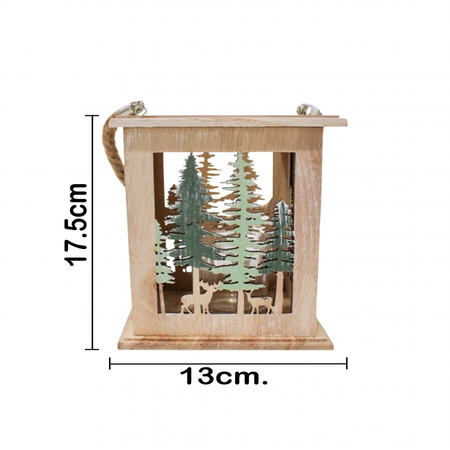Un rústico candelabro de madera con un diseño de ciervos y pinos navideños, con medidas de 13x13x18 cm. Ideal para añadir un toque de luz y calidez.