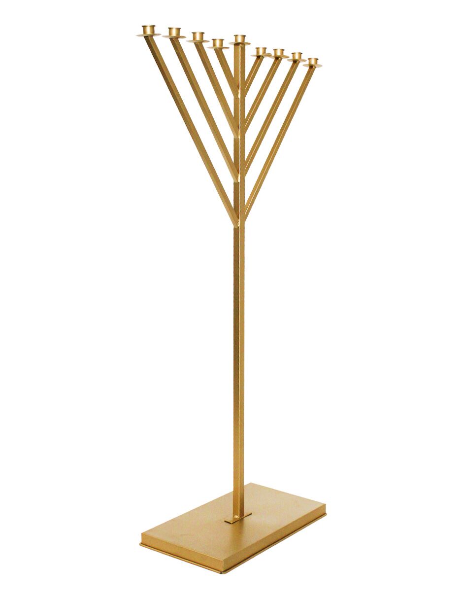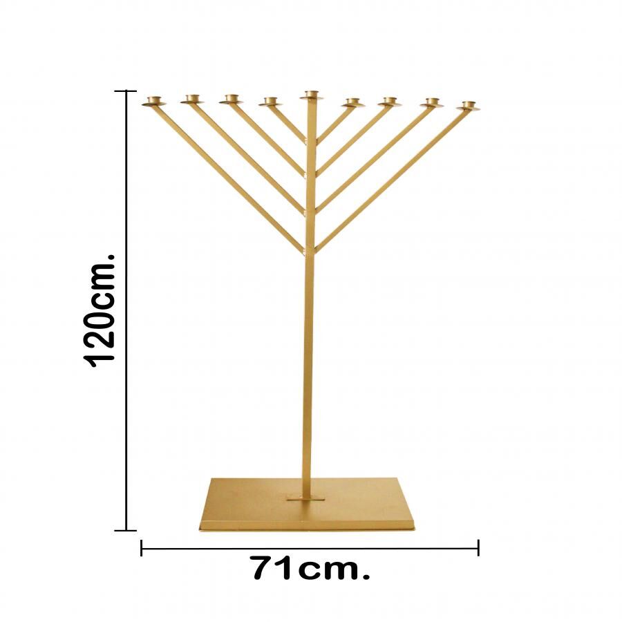 Aporta un toque de elegancia a tu hogar con este candelabro de Janucá de metal dorado. Con 9 brazos, te hará sentir la sofisticación y el brillo. Mide 70x24x121 cm, ideal para decorar tu mesa o repisa.