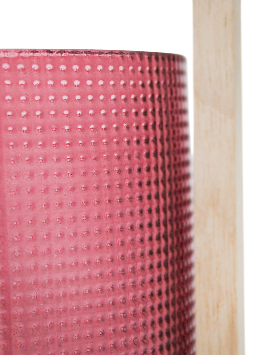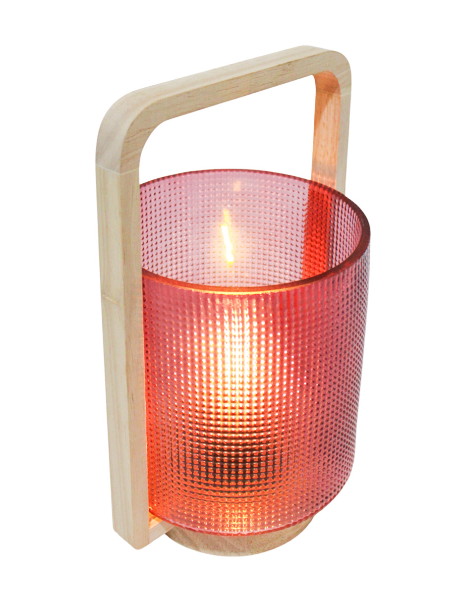 Candelabro rojo con una agarradera de madera. Esta pieza es ideal para quienes buscan una decoración moderna, funcional y llena de estilo. Su diseño minimalista y color vibrante evoca una sensación de frescura y alegría, perfecta para crear un ambiente único que ilumine tus noches. Material: cerámica y madera.