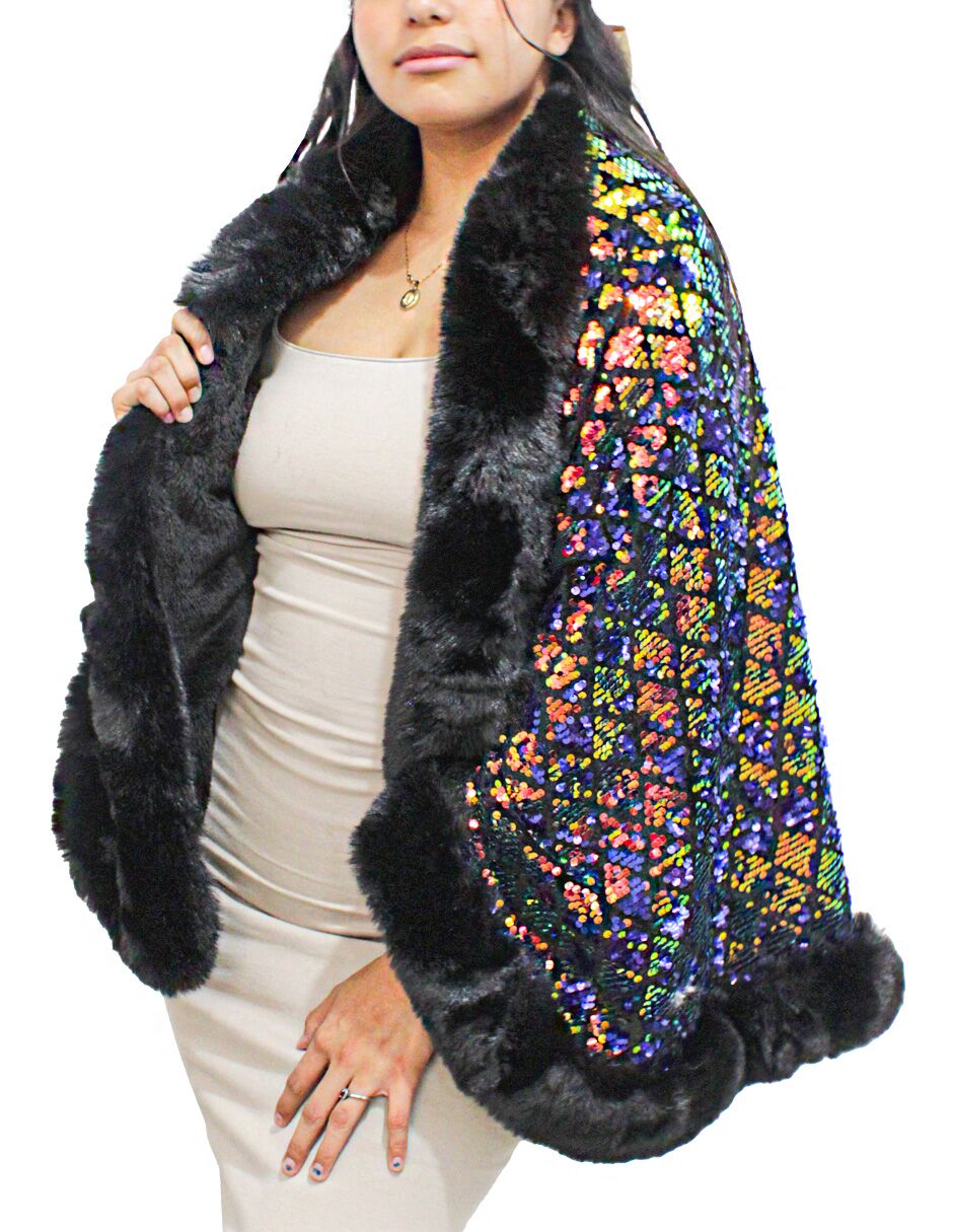 Capa de invierno negra con dorado y orilla de peluche con lentejuelas de 96x74x0.1cm
