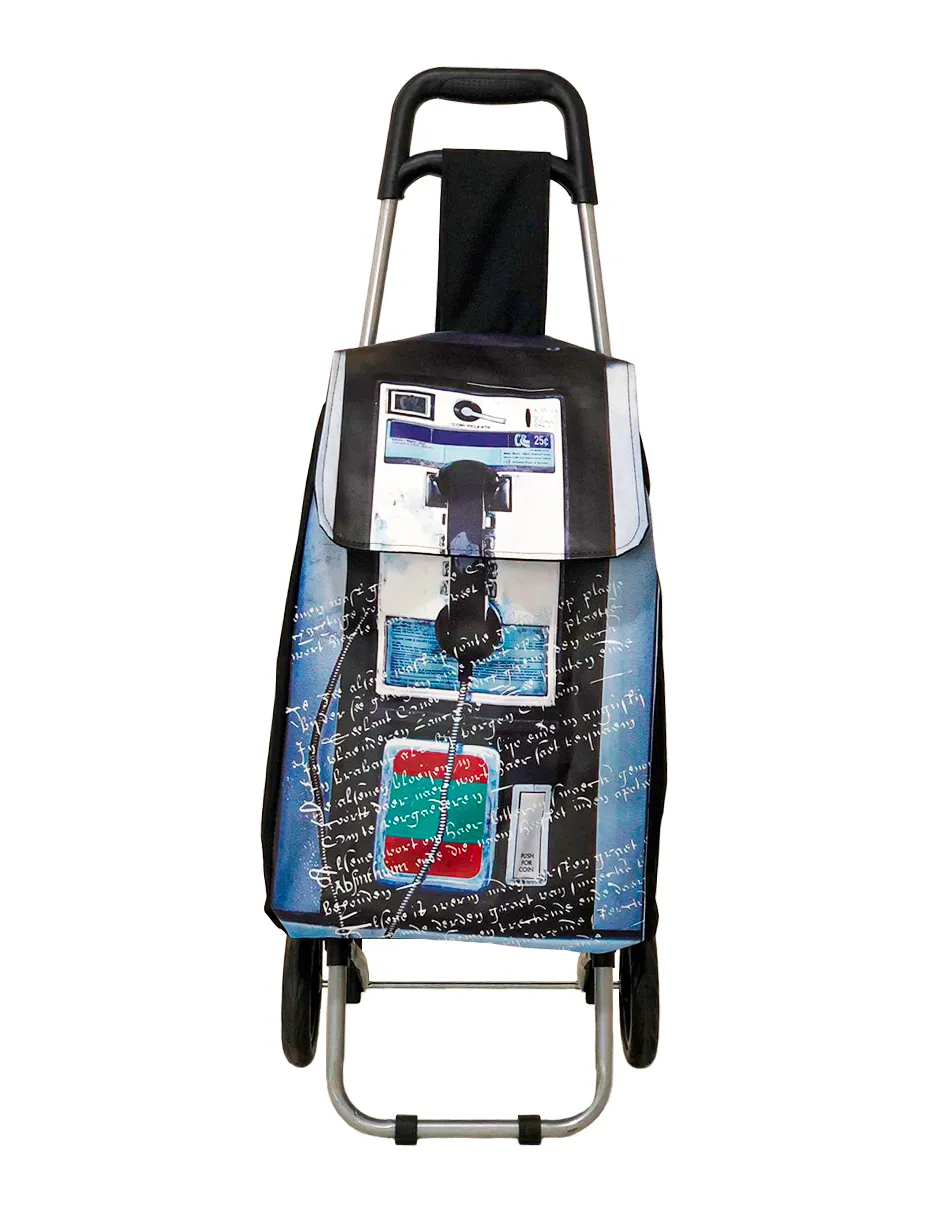 Carro de mandado con un original diseño que simula un antiguo teléfono público. Ideal para quienes aprecian el estilo retro. El material es metal y tela sintética. Medidas: 35 x 28 x 95 cm.