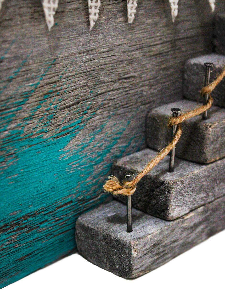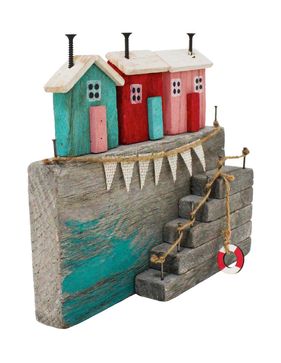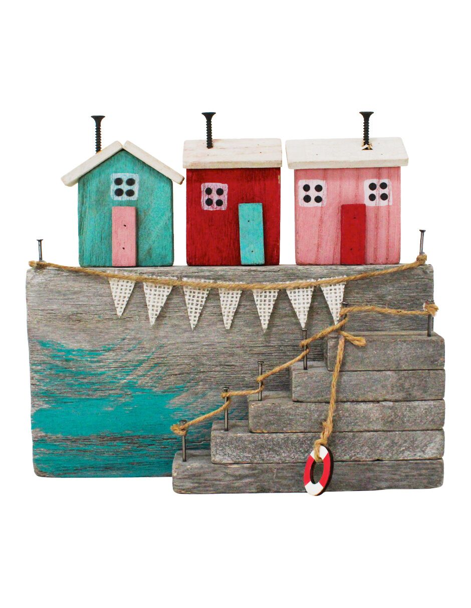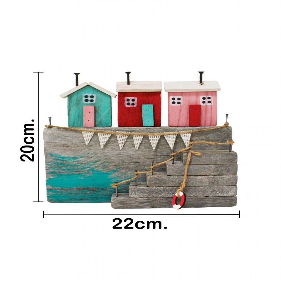 Decoración con un original diseño de casa de playa con escaleras. Esta pieza es ideal para quienes buscan una decoración marinera y rústica. Su diseño único evoca una sensación de frescura y tranquilidad, perfecta para crear un ambiente único y lleno de encanto. Material: madera.