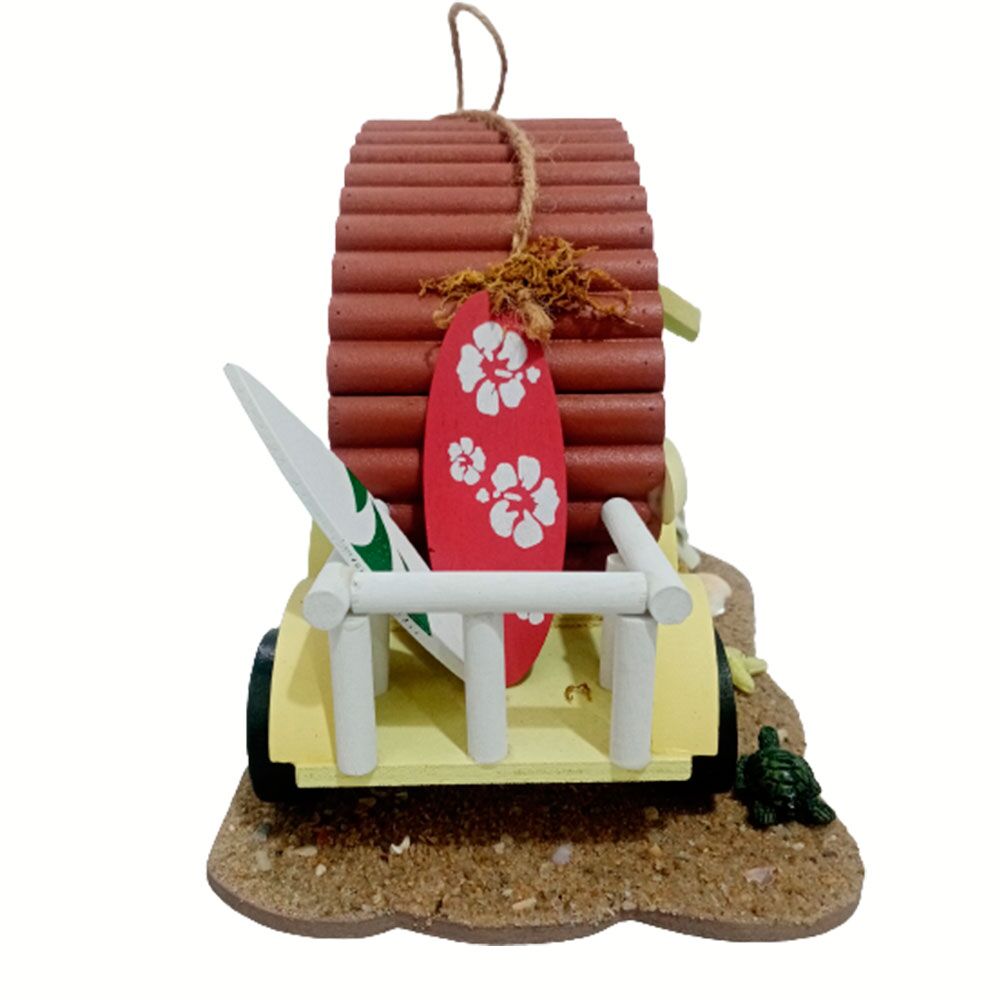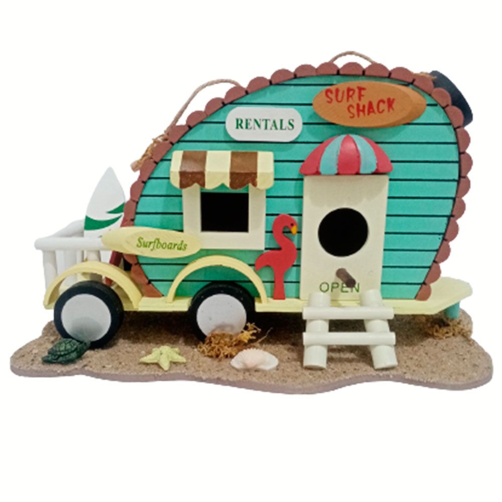 También transmite una sensación de alegría y aventura a través de sus accesorios escenográficos, como los toldos rayados, las estrellas de mar y el letrero de “Rentals”, que capturan la esencia de la exclusividad al aportar un toque de lujo narrativo a cualquier estancia. Su apariencia refinada invita a la sonrisa mientras disfrutas de una pieza de alto impacto visual y equilibrio cromático entre el turquesa, el coral y el amarillo. Funciona perfectamente en cualquier circunstancia decorativa, actuando como el escenario ideal para atraer la vida silvestre sobre un fondo artístico y funcional. De hecho, este elemento permite que tu zona exterior resalte con mucha fuerza hoy mismo de forma imponente. Además, la estética de esta casa para aves casa rodante simboliza el relax y el éxito en el diseño de exteriores creativos.