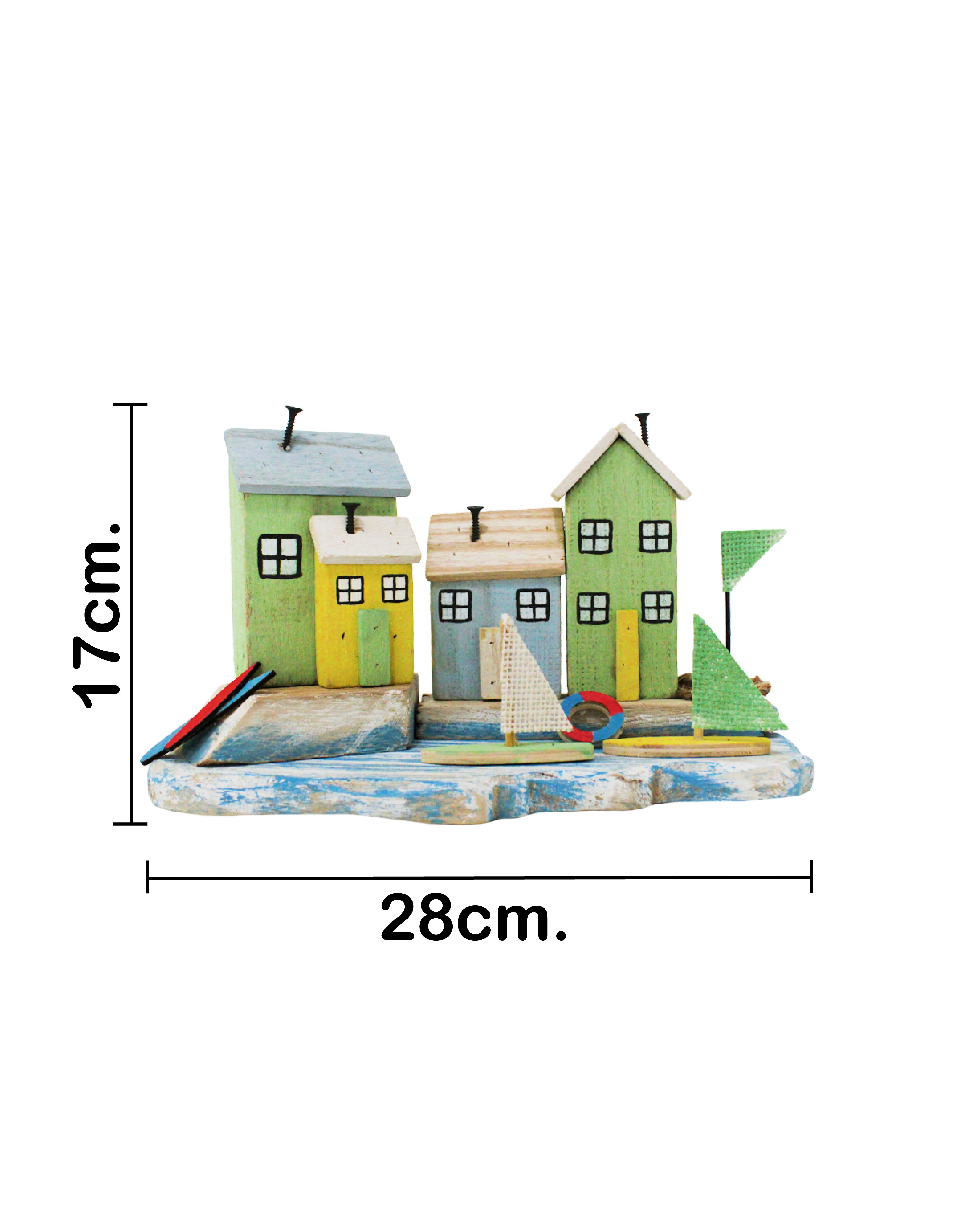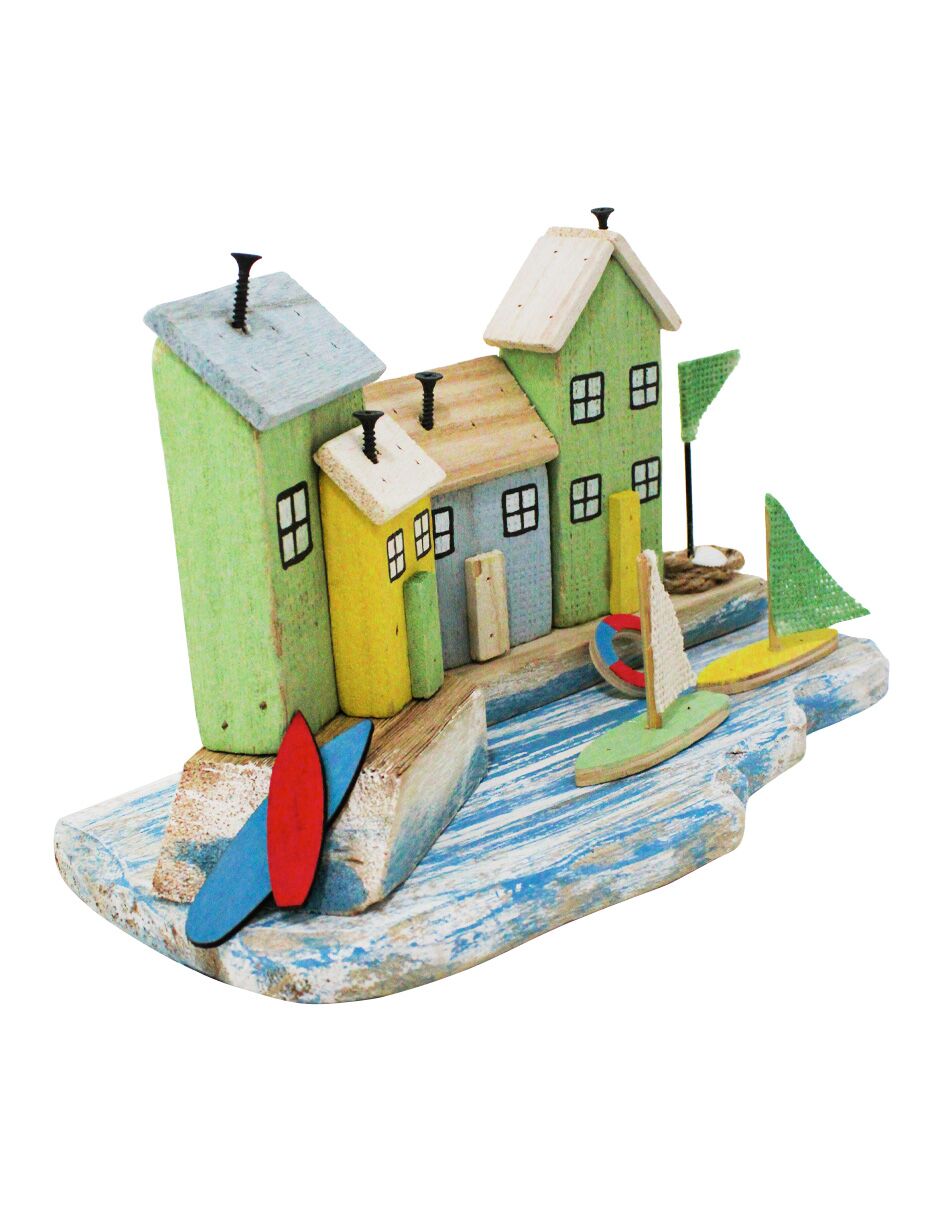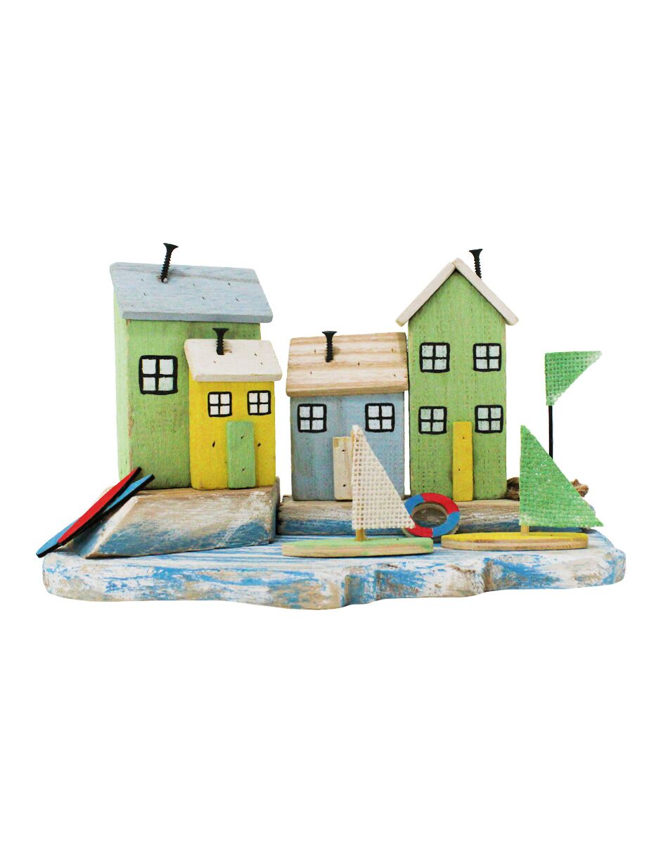 Decoración con un original diseño de casas de playa con veleros. Esta pieza es ideal para quienes buscan una decoración marinera y rústica. Su diseño único evoca una sensación de frescura y tranquilidad, perfecta para crear un ambiente único y lleno de encanto. Material: madera.