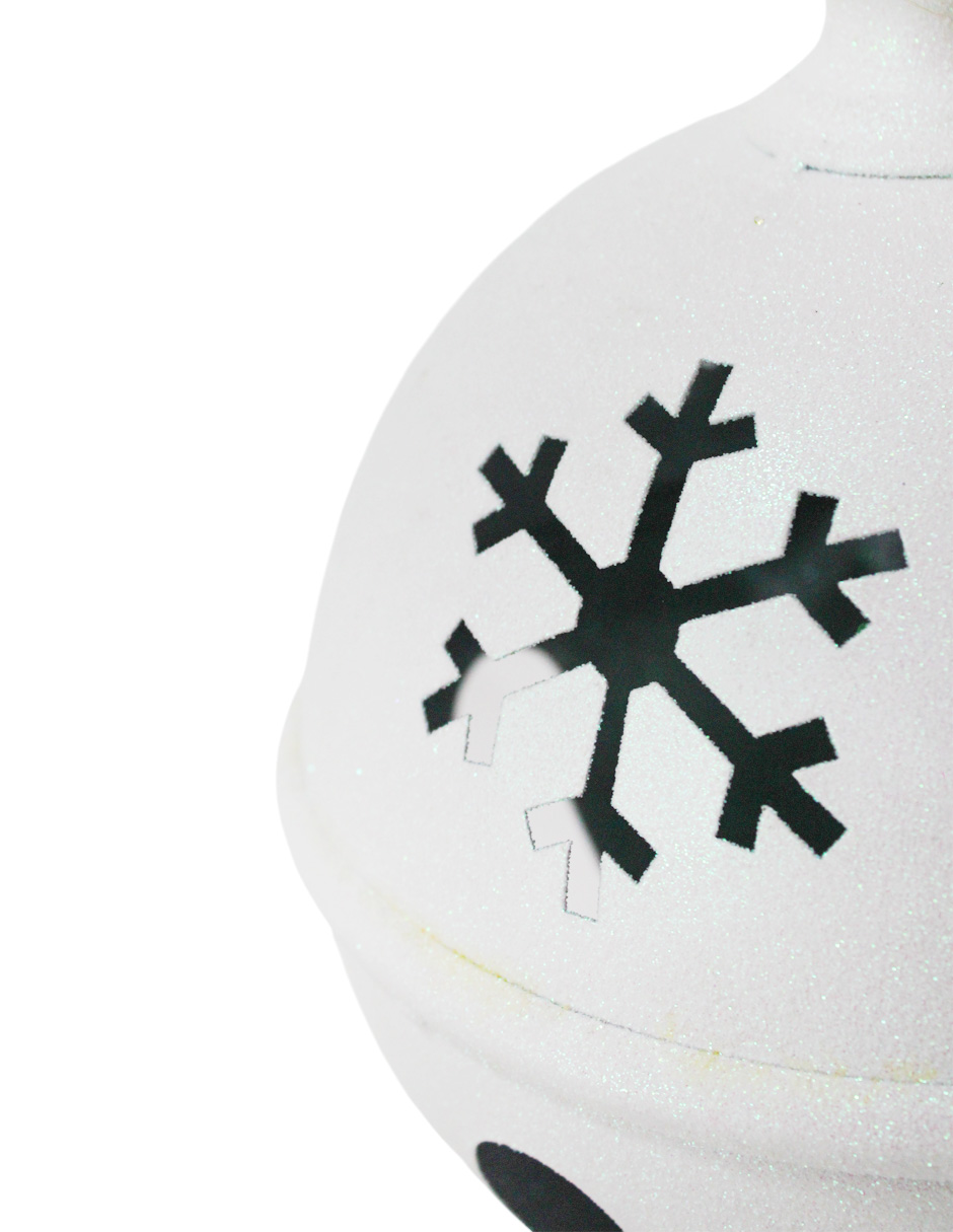 Cascabel decorativo de color blanco con un elegante acabado diamantado y un diseño de copo de nieve calado. Es perfecto para añadir un toque de lujo y magia invernal a tu decoración navideña. Material: metal. Medidas: 20.5×20.5×27.5cm.