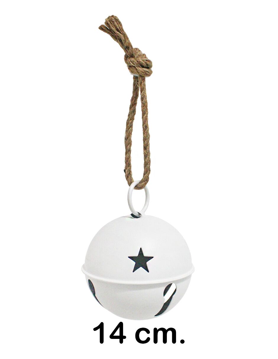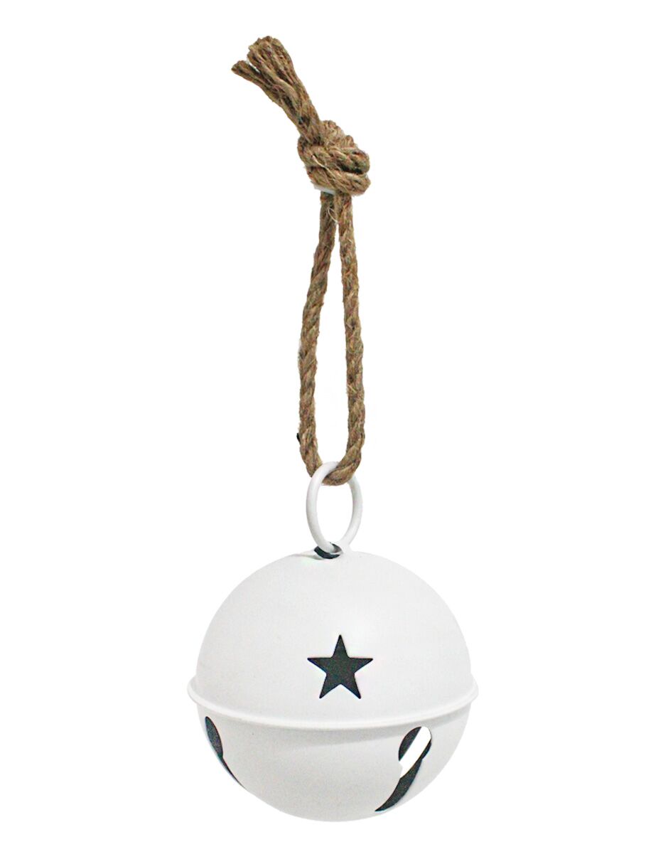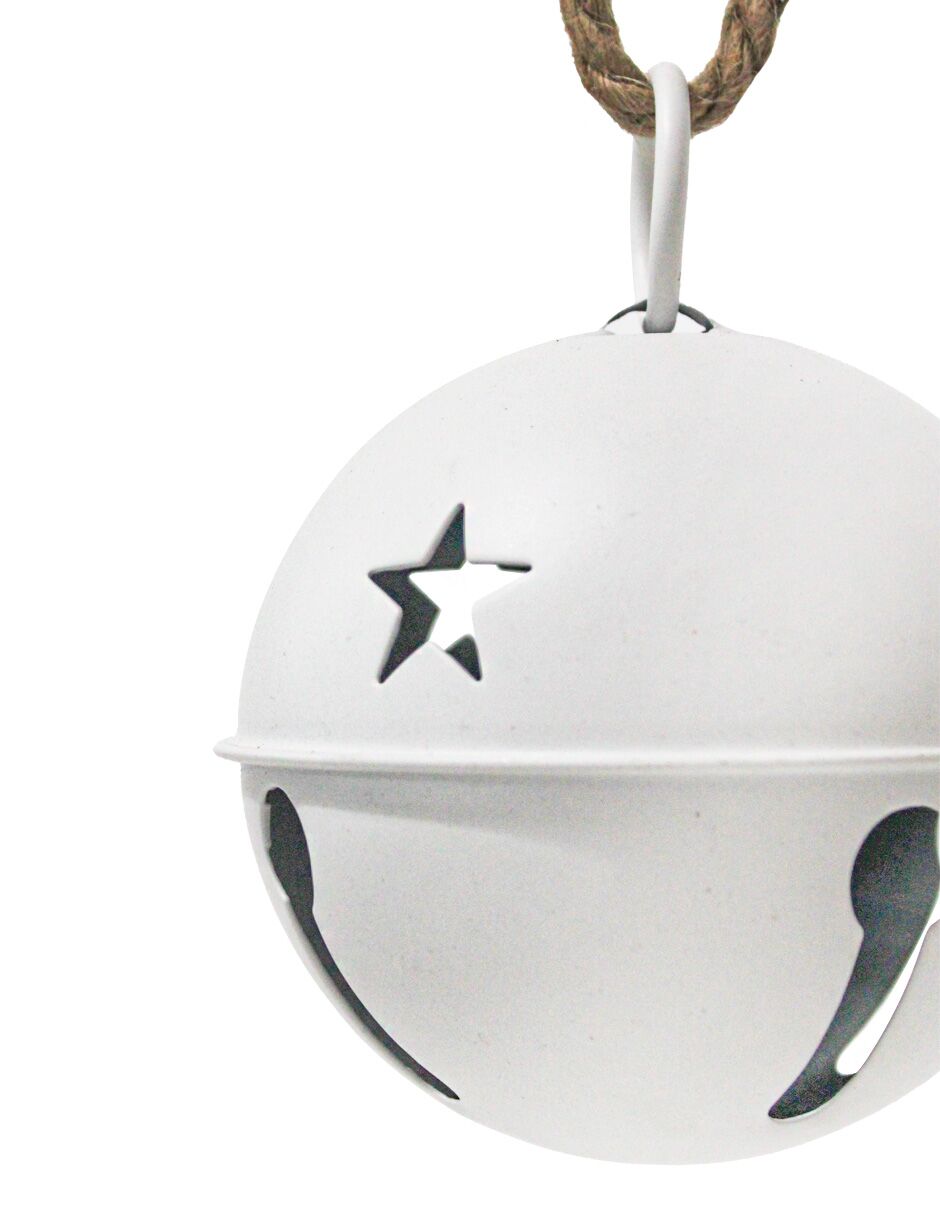 Cascabel de metal con un acabado blanco mate y diseño calado de estrellas. Medidas: 25 cm. Su gran tamaño, color puro y diseño invernal evocan paisajes nevados, añadiendo un toque de elegancia y serenidad a tu decoración.