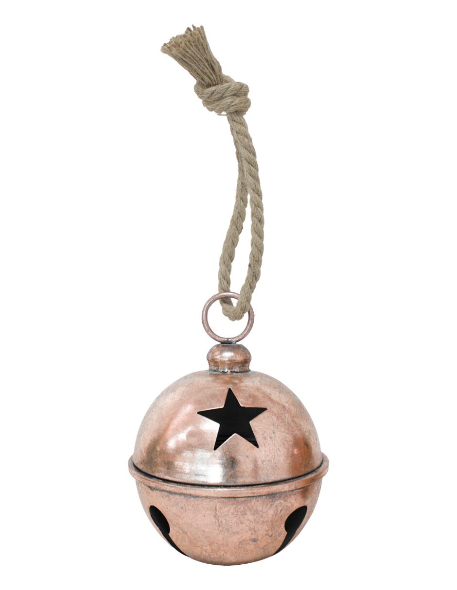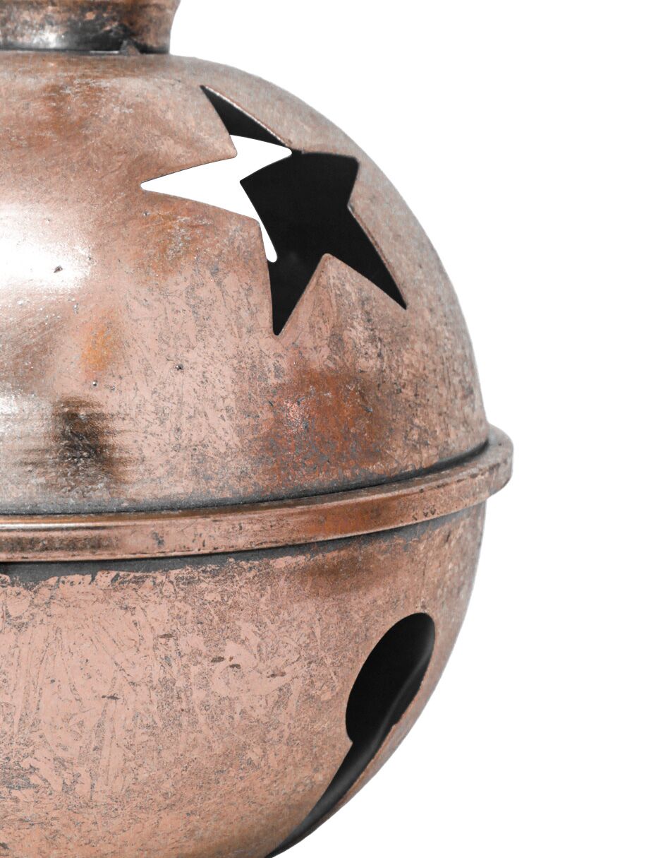 Cascabel de metal con acabado en cobre y diseño calado de estrellas. Medidas: 10 cm. Su tono cálido y el efecto luminoso que crea son perfectos para añadir una sensación de calidez y un toque rústico a tu hogar.