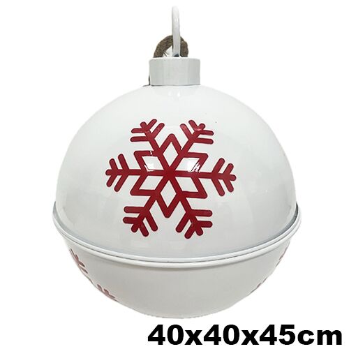 Inyecta la magia invernal y el espíritu festivo a tu decoración con este imponente cascabel metálico. Su diseño en inmaculado tono blanco se adorna con un vibrante copo de nieve en color rojo, creando un contraste visual clásico, elegante y de máxima distinción. El suave tintineo del cascabel es el acento perfecto para infundir calidez, alegría y el sonido auténtico de la temporada en tu árbol o entrada. Material: Metal. Medidas: 40 x 40 x 45 cm.