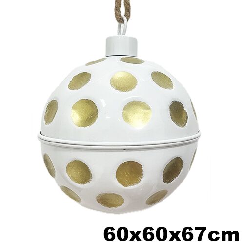 Inyecta el máximo estilo moderno y un brillo sofisticado a tu decoración con este imponente cascabel metálico. Su diseño en inmaculado tono blanco se contrasta elegantemente con un patrón de puntos dorados, creando un acento visual fresco, chic y distinguido. El suave tintineo del cascabel es el acento perfecto para infundir alegría, elegancia contemporánea y el sonido auténtico de la temporada en tu árbol o entrada, ideal para un estilo navideño moderno y luminoso. Material: Metal. Medidas: 60 x 60 x 67 cm.