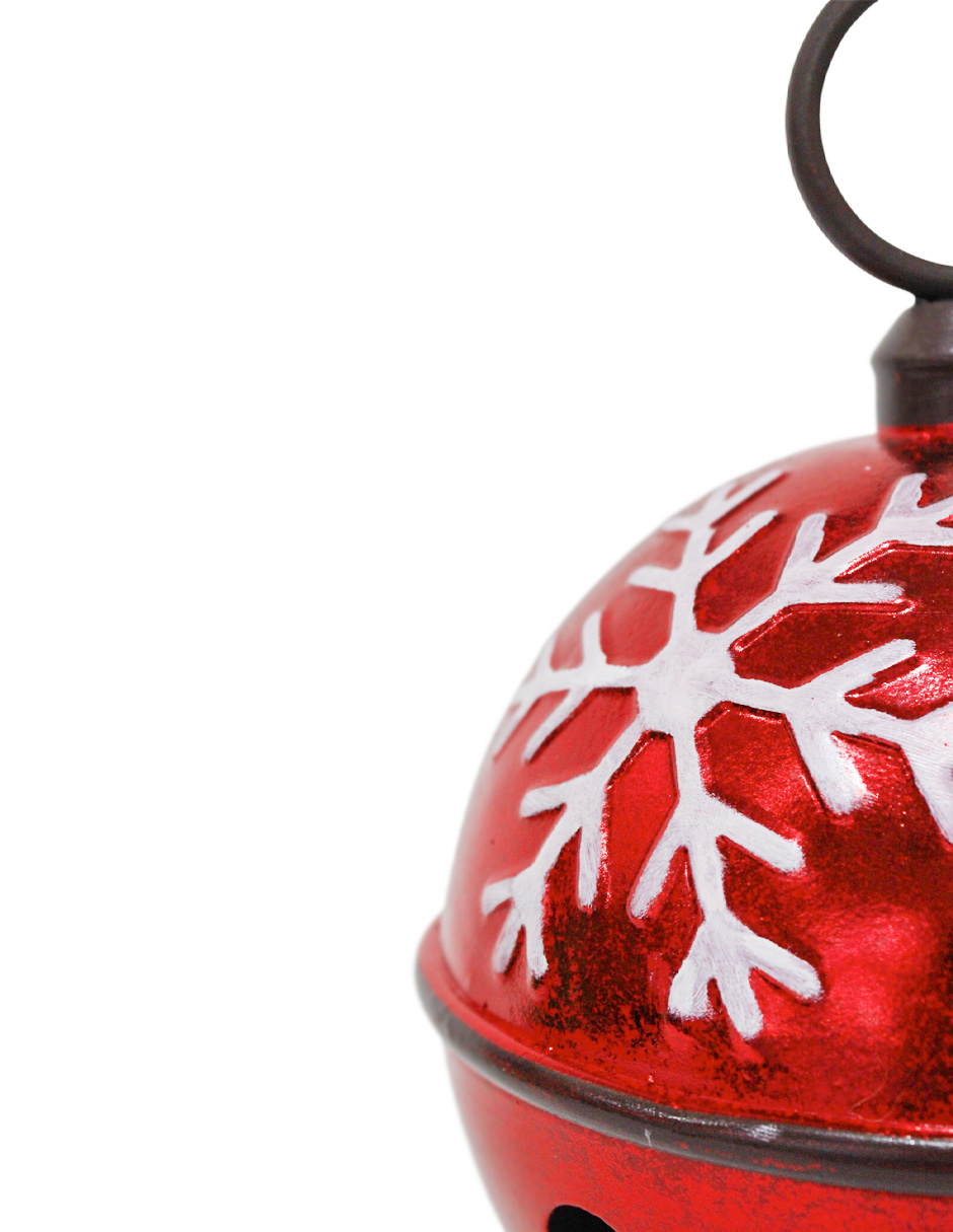 Cascabel decorativo de metal en un vibrante color rojo, con un elegante diseño de copos de nieve en color blanco. Ideal para añadir un toque de brillo y elegancia invernal a tu decoración. Material: metal. Medidas: 16x16x23cm.