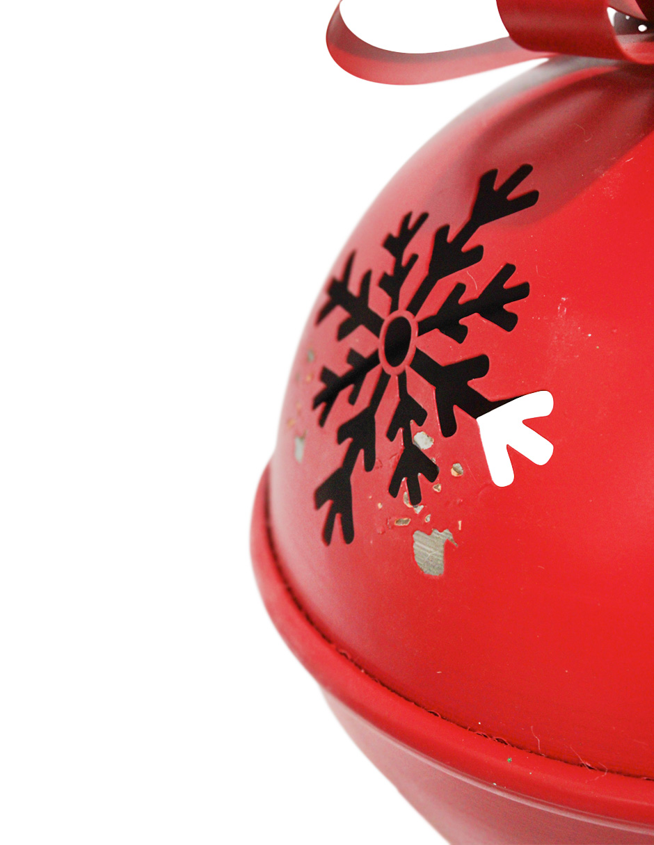 Cascabel decorativo de metal en un vibrante color rojo, con un elegante diseño de copos de nieve en color dorado y un moño blanco. Ideal para añadir un toque de brillo y elegancia invernal a tu decoración. Material: metal y tela. Medidas: 21x21x27cm.