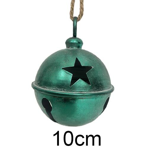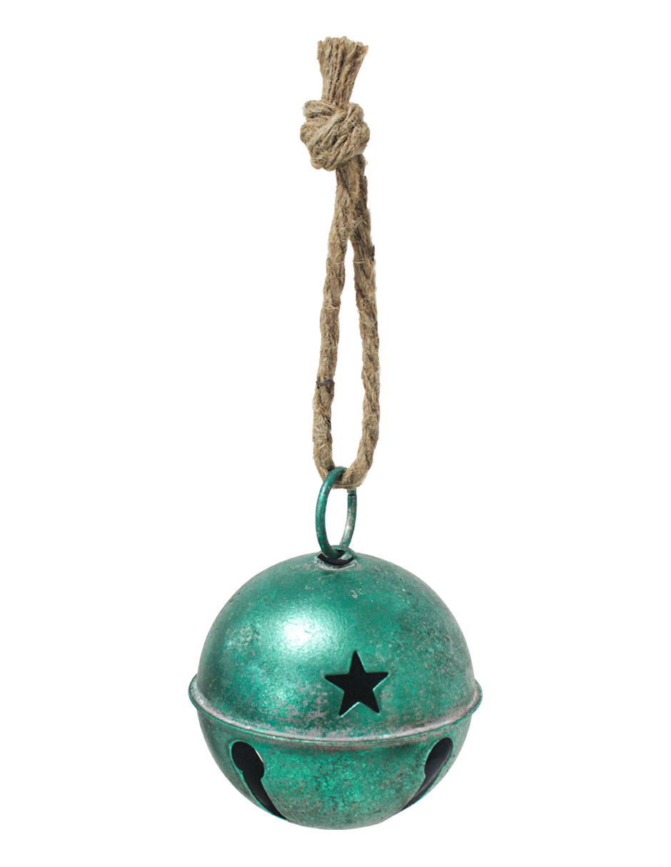Cascabel de metal con un acabado verde vintage y diseño calado de estrellas. Medidas: 50 cm. Su color clásico y el diseño rústico son ideales para crear un ambiente tradicional, cálido y lleno de encanto.