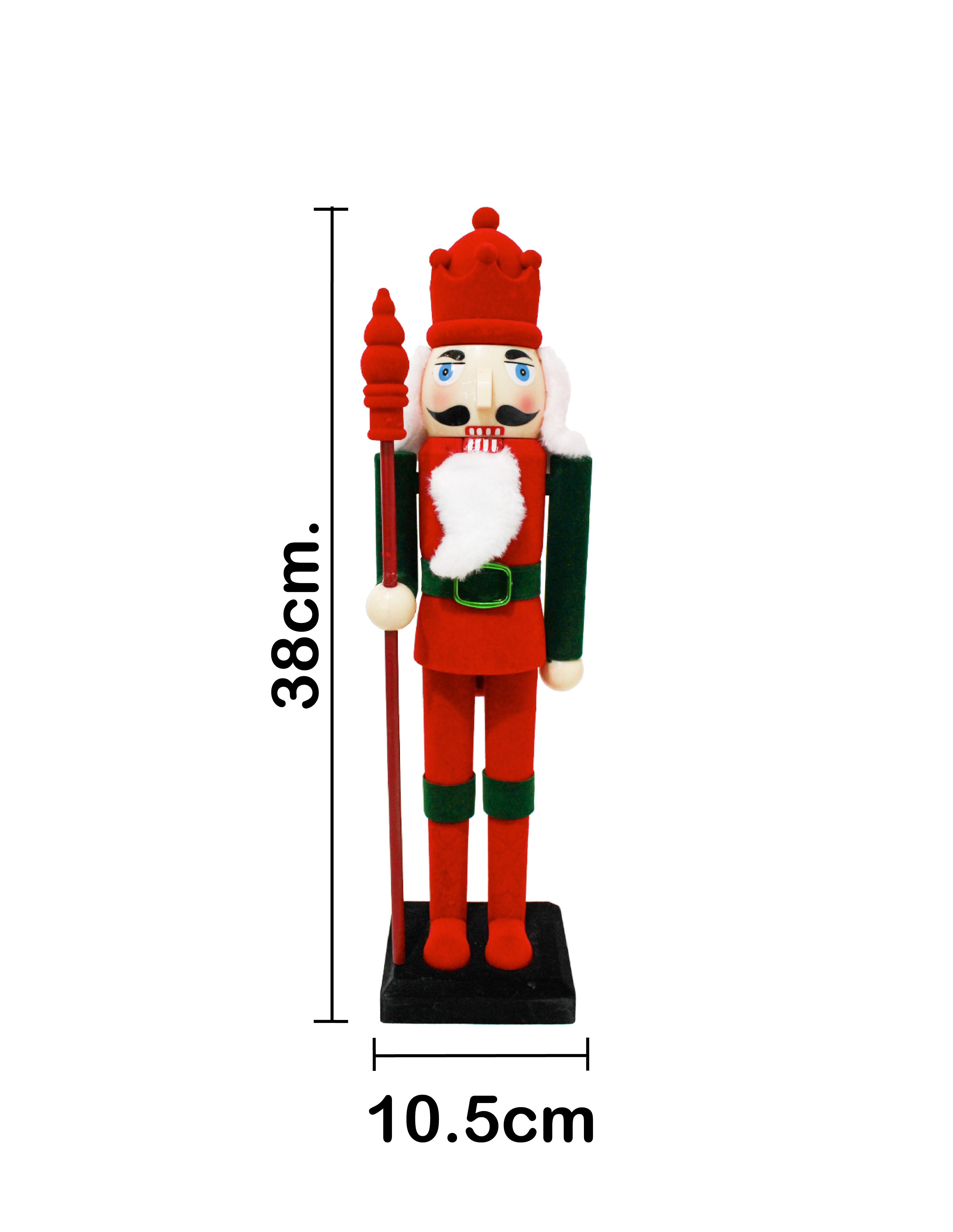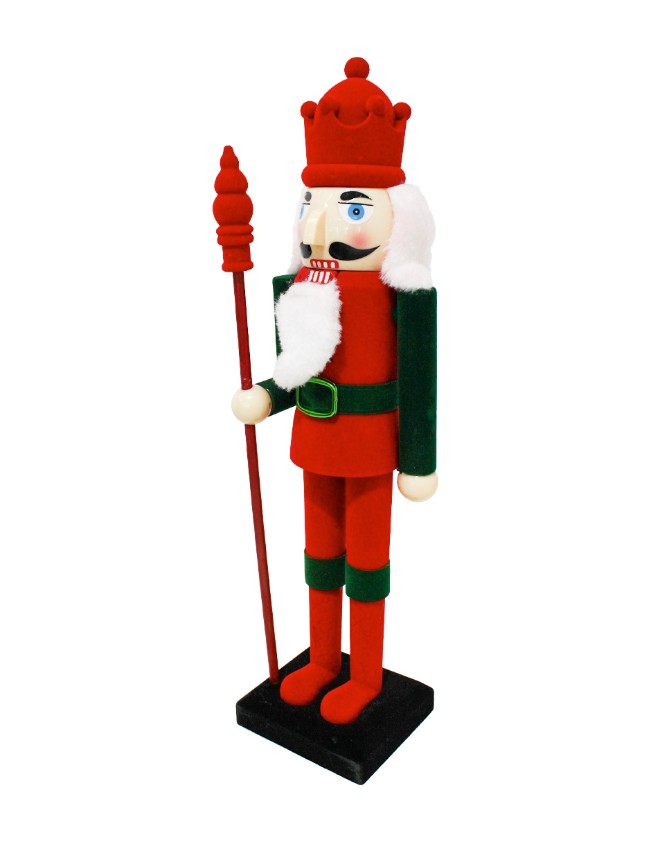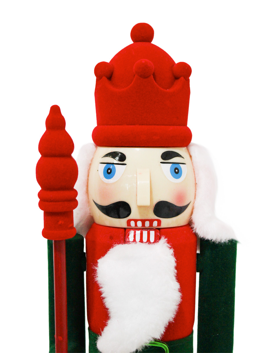 Cascanueces decorativo con un vibrante traje en colores rojo y verde. Ideal para dar un toque clásico y festivo a tus espacios. Material: plástico. Medidas: 40cm.