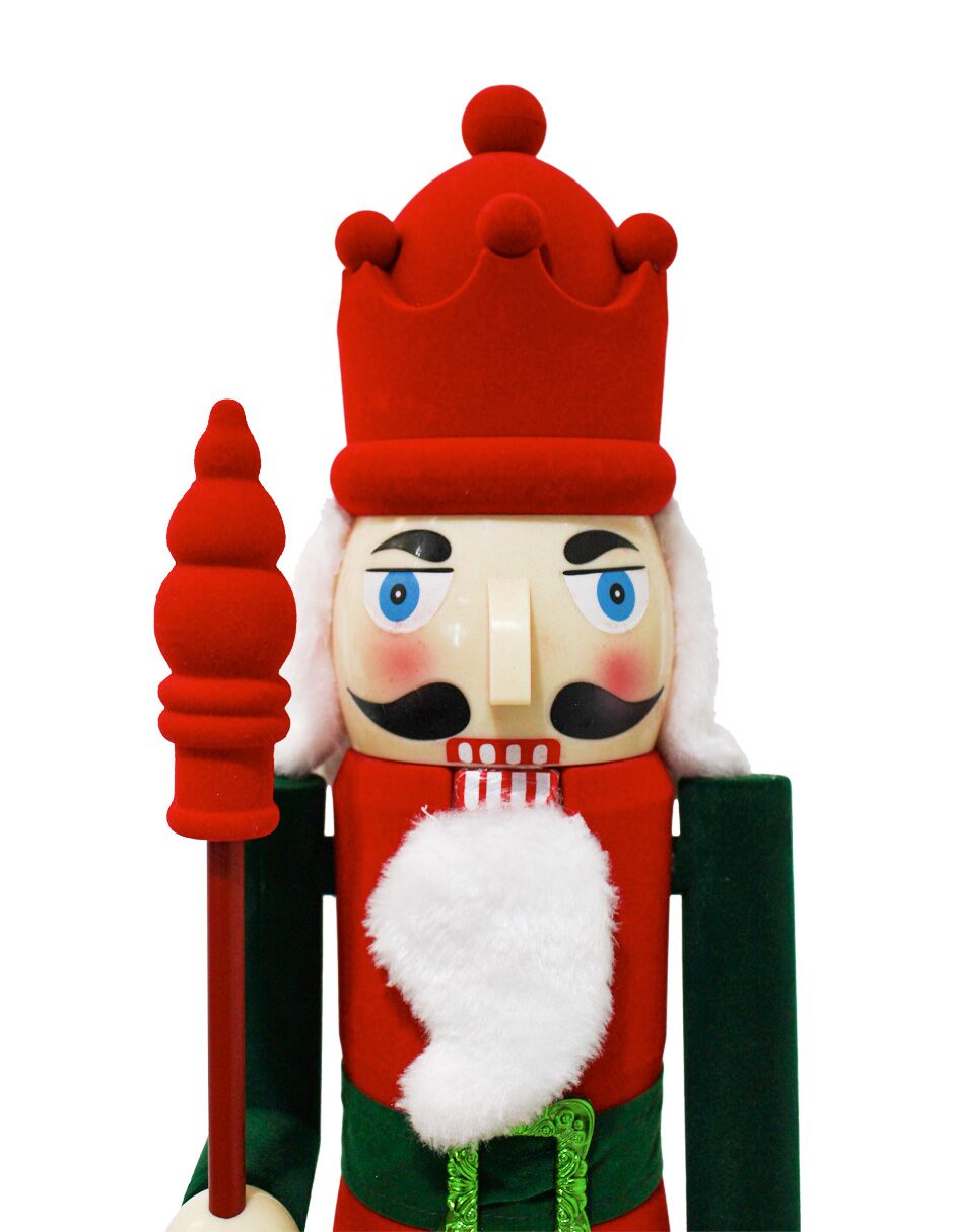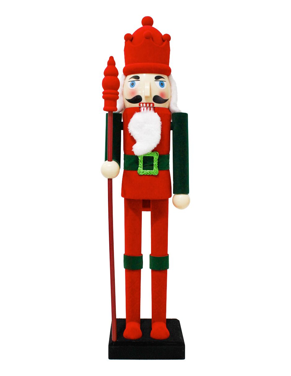 Cascanueces decorativo con un vibrante traje en colores rojo y verde. Ideal para dar un toque clásico y festivo a tus espacios. Material: plástico. Medidas: 60cm.