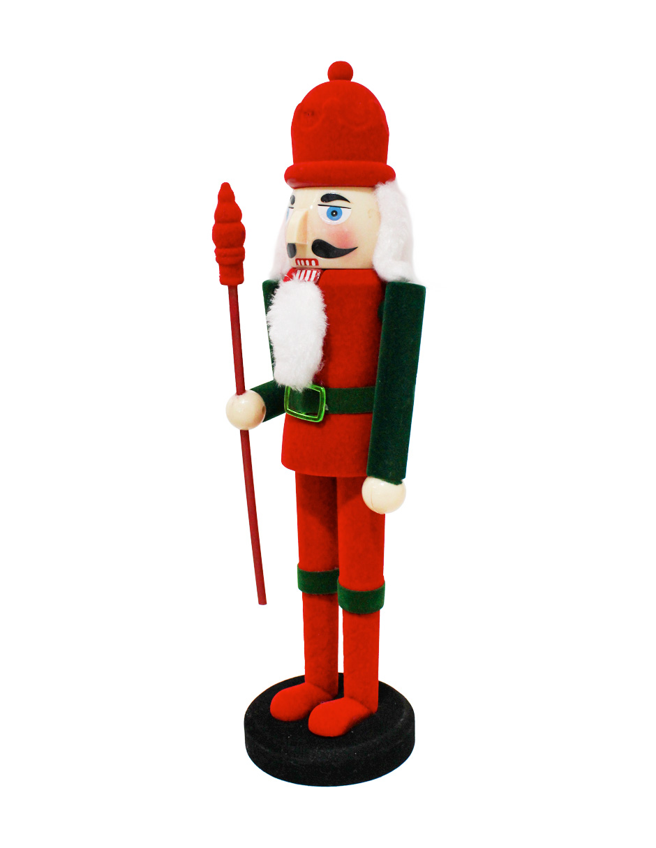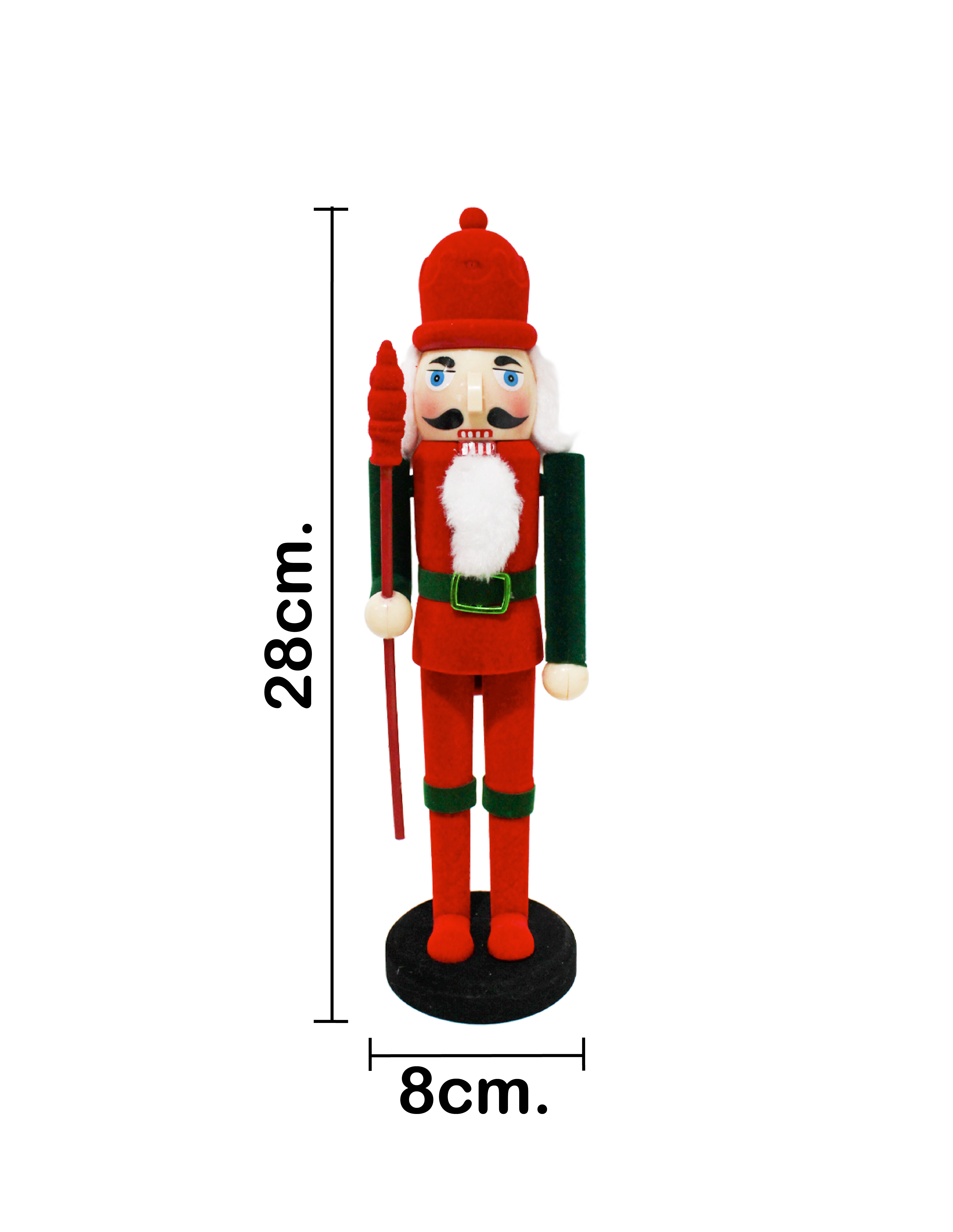 Cascanueces decorativo con un vibrante traje en colores rojo y verde. Ideal para dar un toque clásico y festivo a tus espacios. Material: plástico. Medidas: 28cm.