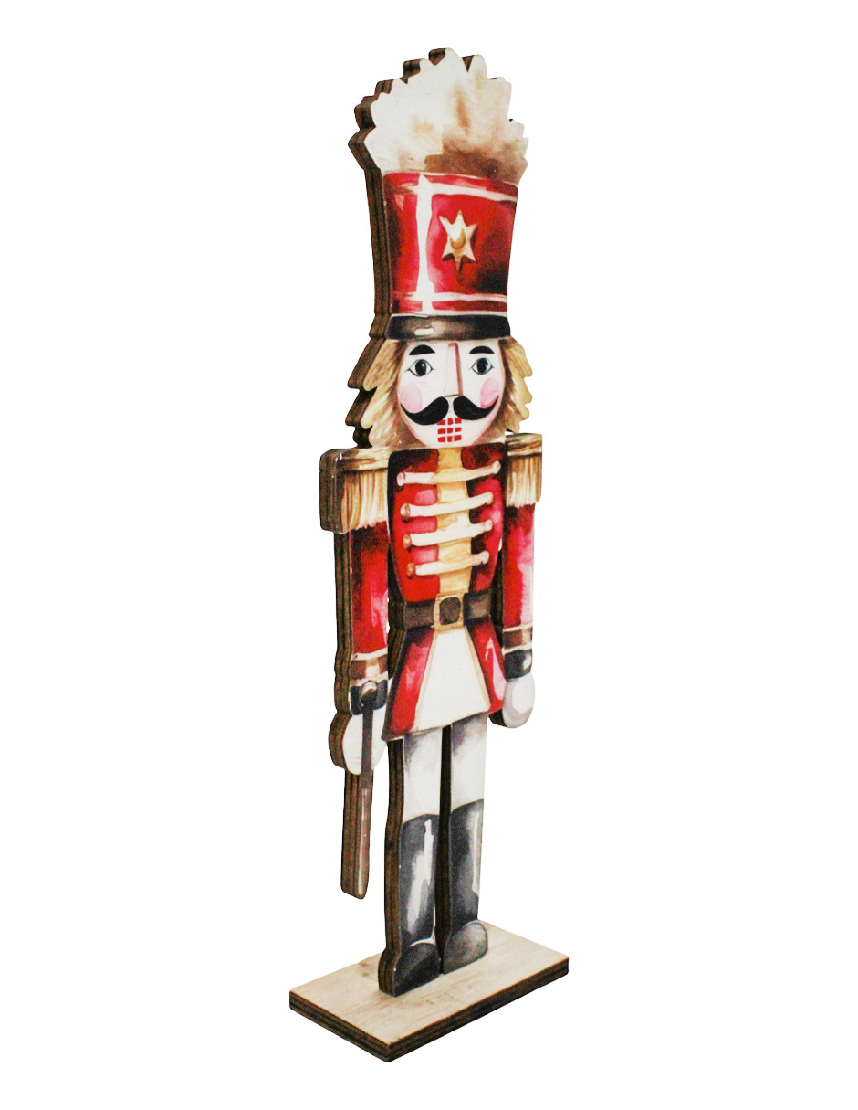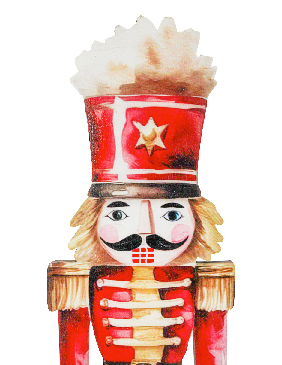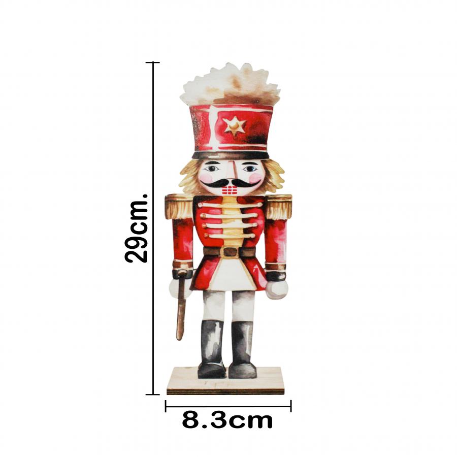 Un festivo cascanueces de madera rojo con detalles en dorado, con medidas de 10.5×29.5×3.5 cm. Ideal para un toque de tradición y brillo.