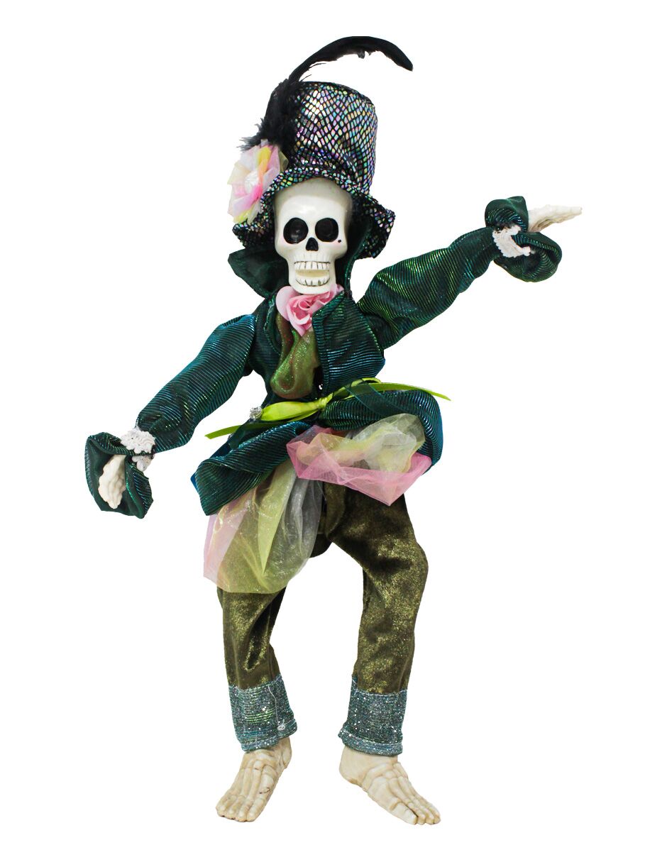 Un elegante Catrín con Traje Verde y Sombrero con Pluma Negra, con una altura de 50cm. Esta figura es ideal para añadir un toque de sofisticación y estilo a tu decoración de temporada.