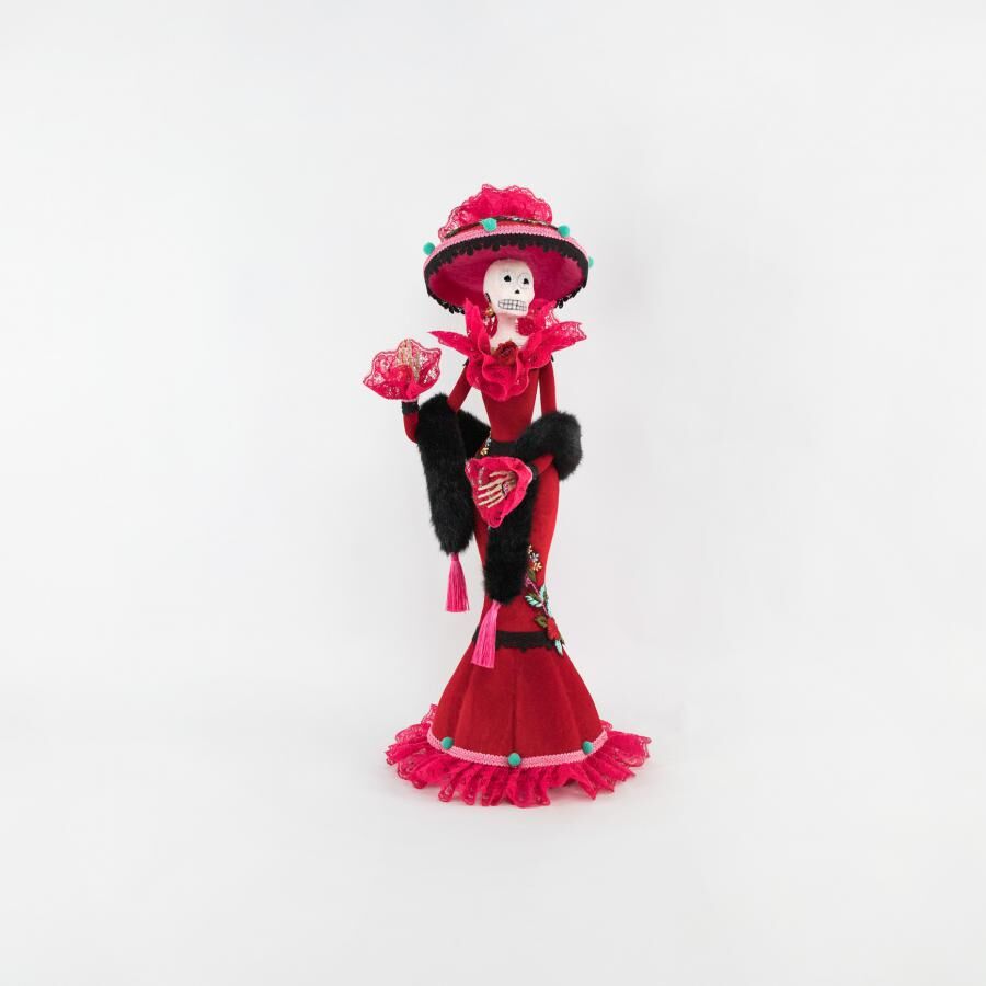 Aporta un toque de elegancia a tu hogar con esta catrina con un majestuoso vestido rojo. Su diseño te hará sentir la cultura y la pasión del Día de Muertos. Medidas: 30x25x68 cm.