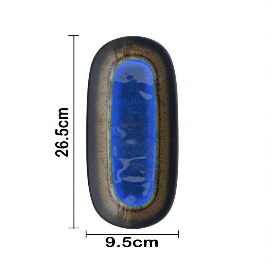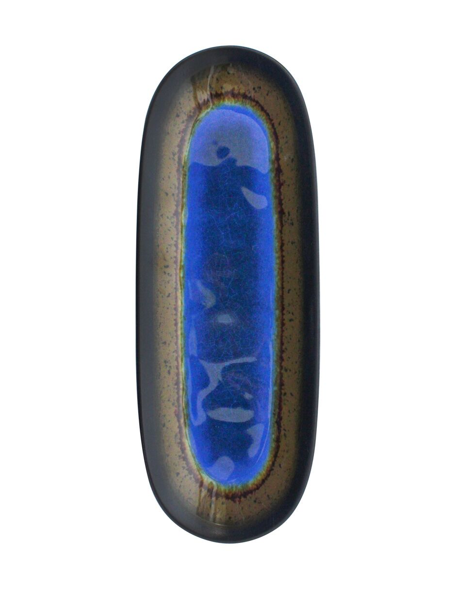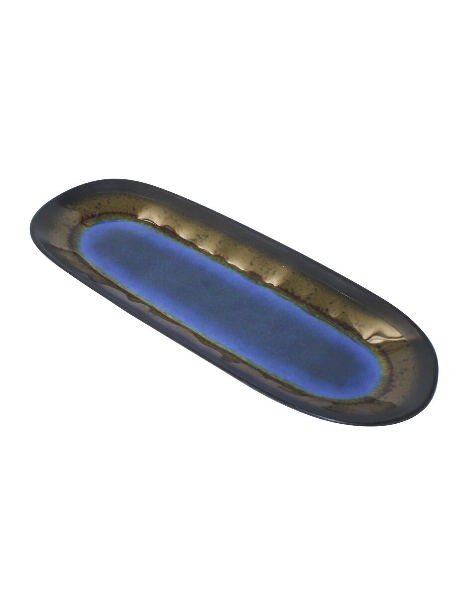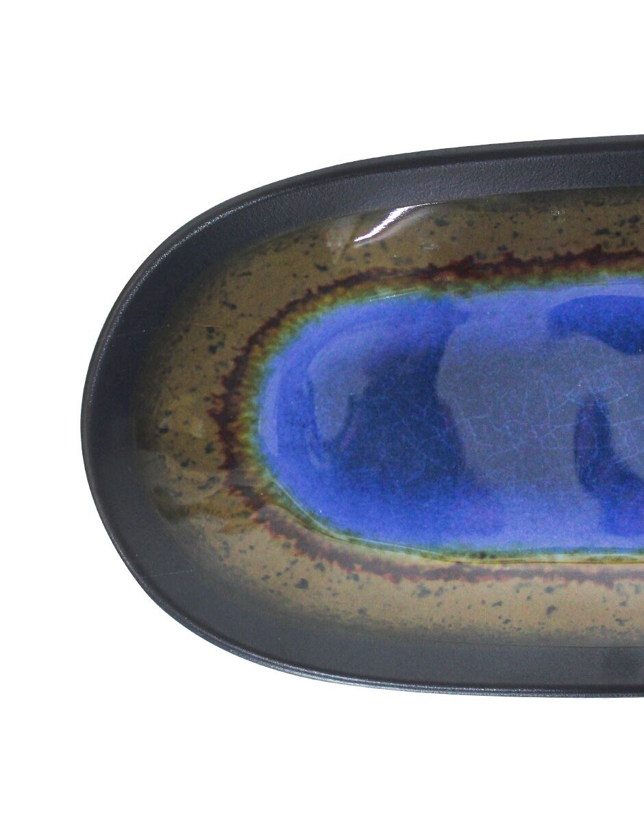 Charola ovalada de servicio fabricada en melamina con un diseño bicolor azul y café. Ideal para aperitivos y postres. El material es melamina. Medidas: 26 x 9.5 cm.