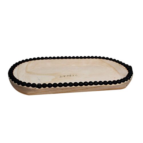 Un toque de sofisticación que evoca tranquilidad. Esta charola ovalada de madera natural de 49x30x4cm con cuentas negras en la orilla es ideal para un estilo costero o escandinavo.