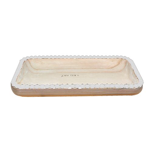 Un toque de diseño que evoca la tranquilidad. Esta charola rectangular de madera natural de 38x20x4cm con cuentas blancas en la orilla es ideal para un estilo costero o escandinavo.