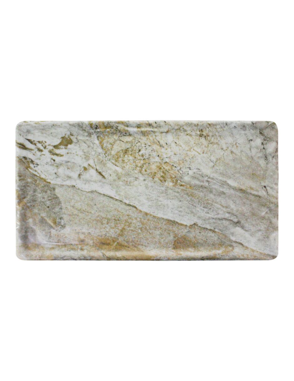 Charola rectangular de servicio fabricada en melamina con un elegante acabado que imita el mármol. Ideal para postres individuales. El material es melamina. Medidas: 32 x 17 x 1.5 cm.