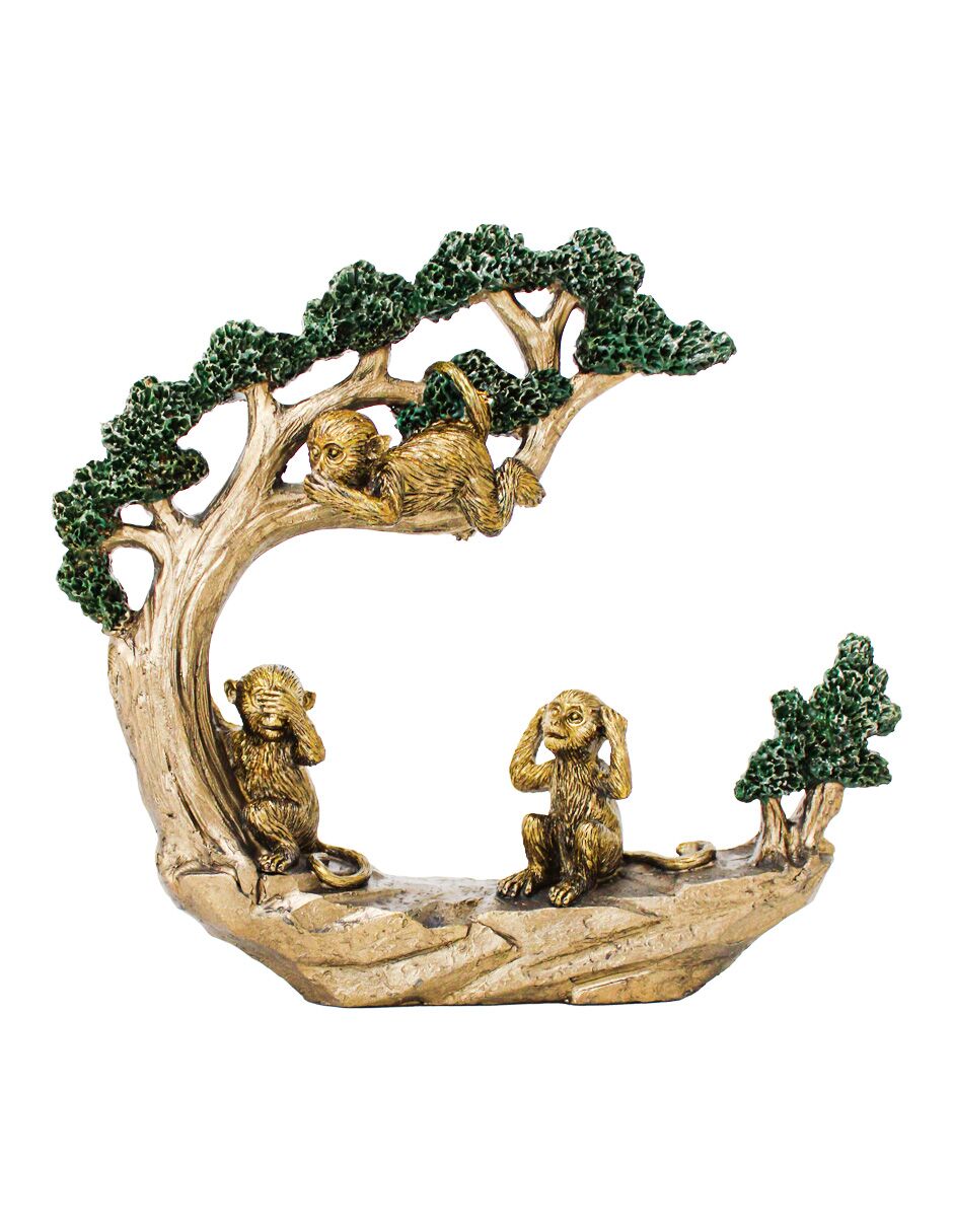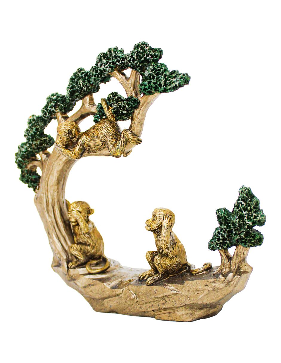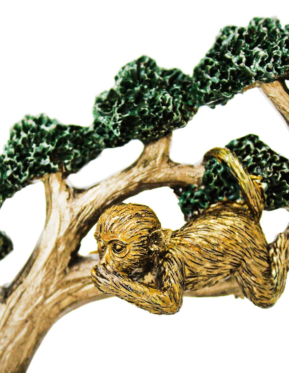 Escultura de chimpancés dorados sobre un árbol de bonsái en resina. Es una pieza de arte que añade un toque de sofisticación y naturaleza a tu hogar.