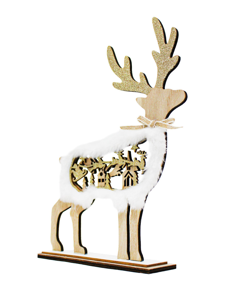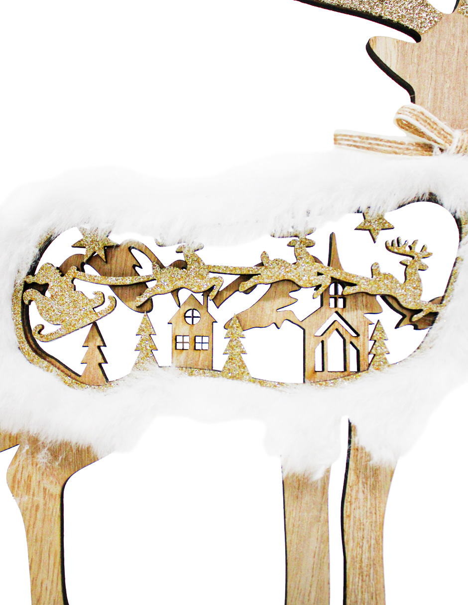 Un encantador ciervo de madera con peluche blanco y un interior con Santa en trineo, con medidas de 20.5x26x4.5 cm. Ideal para añadir un toque de fantasía y tradición.