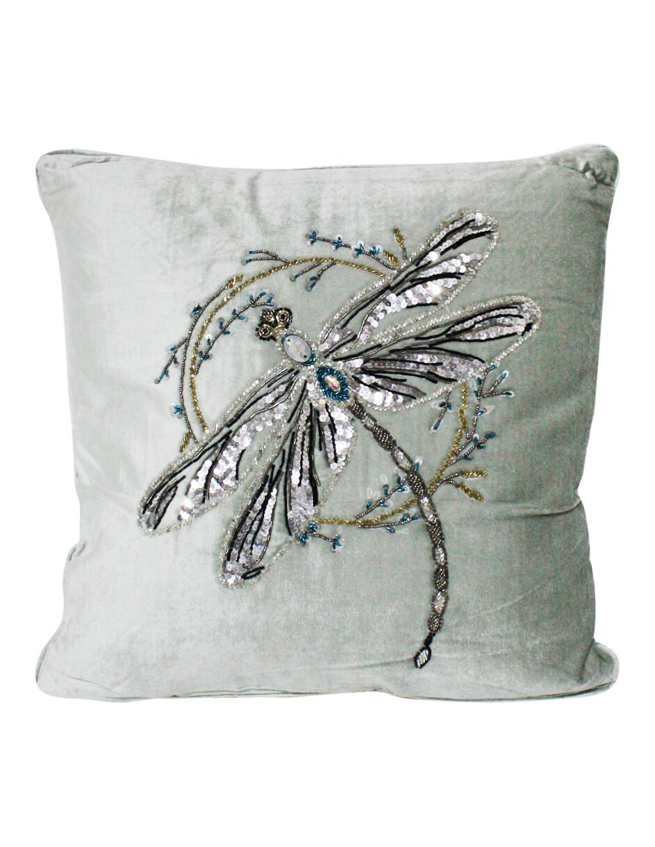 Cojín aqua estampado libélula con chaquiras de 50x50x15cm