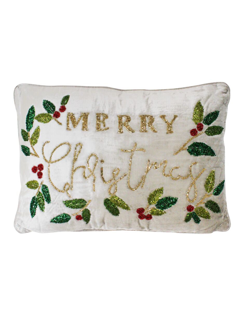 Cojín beige estampado Merry Christmas con chaquiras de 50x35x15cm