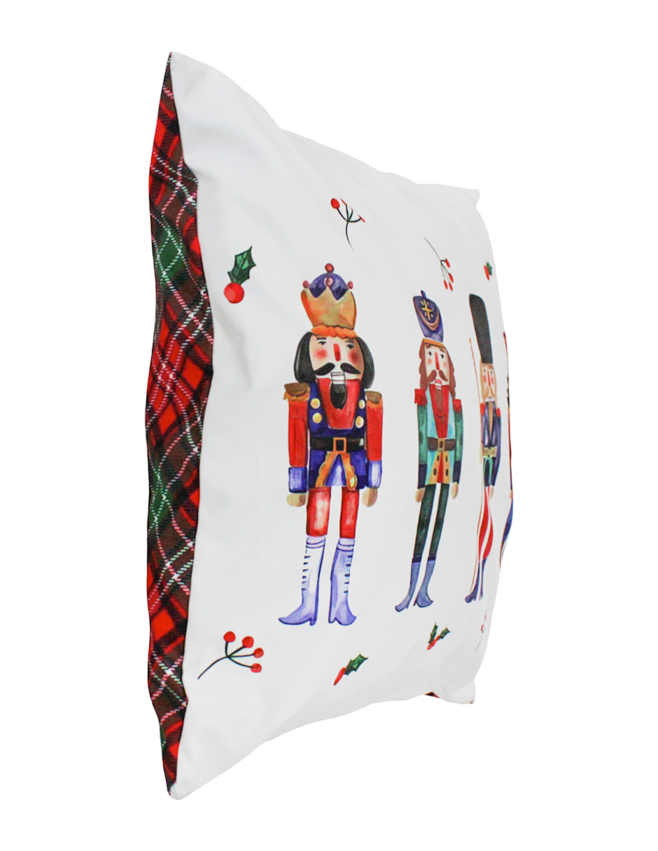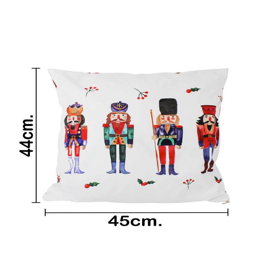 Un festivo cojín blanco con diseños de cascanueces y picks navideños, con medidas de 45×45 cm. Ideal para dar un toque de tradición y color a tu sofá o sillón.