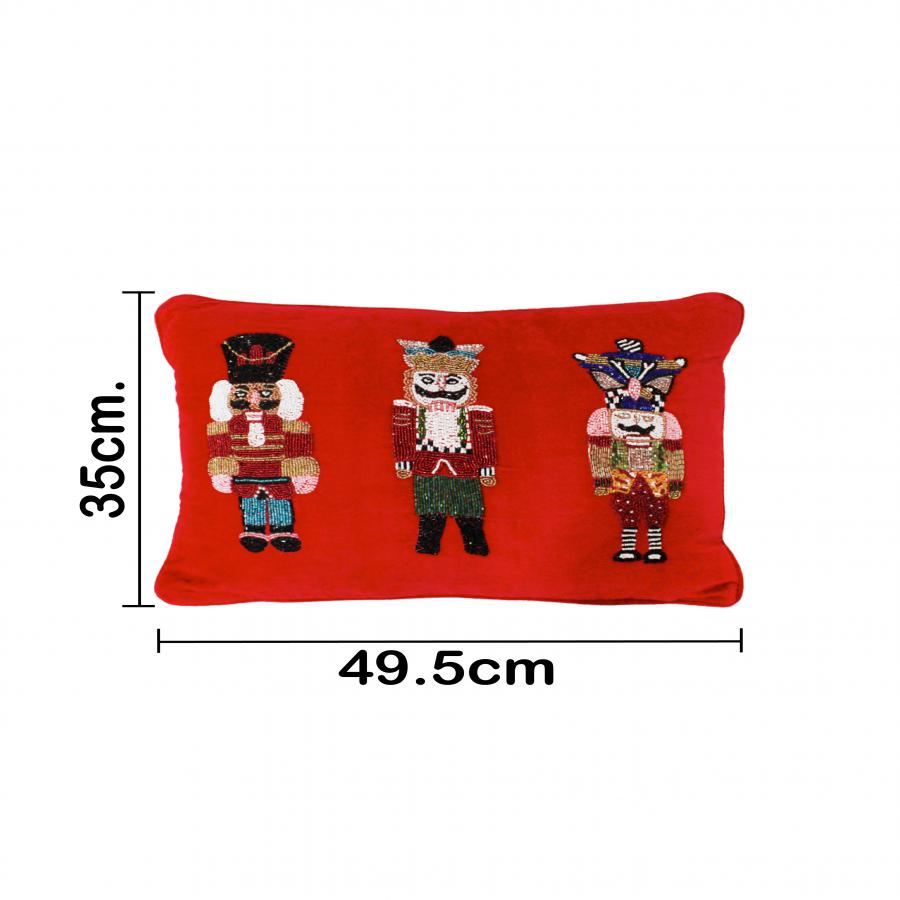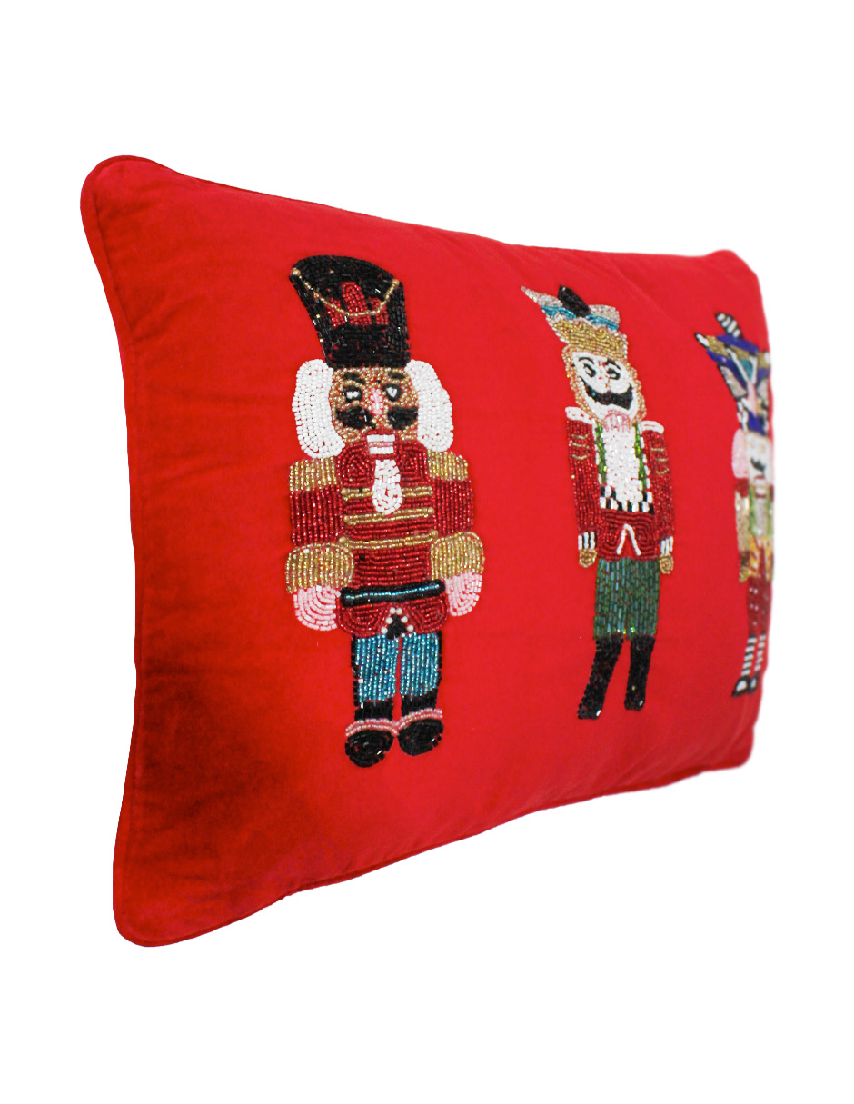El Cojín Cascanueces Bordado Chaquiras es una pieza que irradia lujo festivo y magia navideña. No es solo un cojín, sino un objeto de colección que infunde alegría y sofisticación en tu decoración de temporada. Siente la exclusividad del trabajo artesanal gracias al detallado bordado de tres Cascanueces realizado completamente con chaquiras sobre terciopelo Rojo vibrante. Es ideal para sofás, sillones o como pieza central en tu sala durante el invierno.