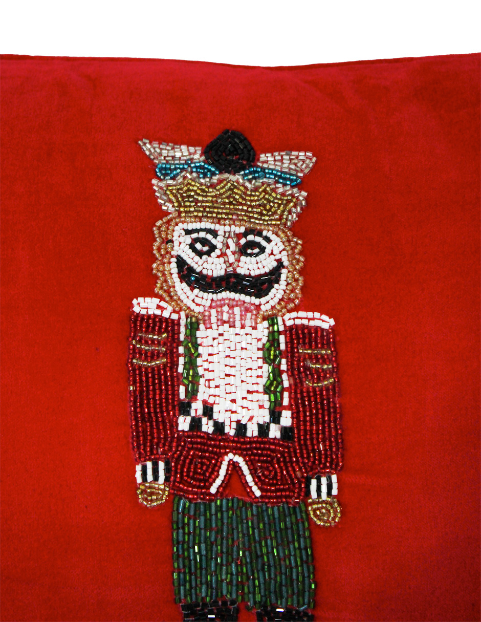El elemento más distintivo es la laboriosa técnica de bordado con chaquiras que da vida a los Cascanueces. Cada figura está llena de color y detalle, añadiendo una textura rica y un brillo sutil que capta la luz. La base de Tela Rojo de alta calidad le confiere una sensación de confort y opulencia.