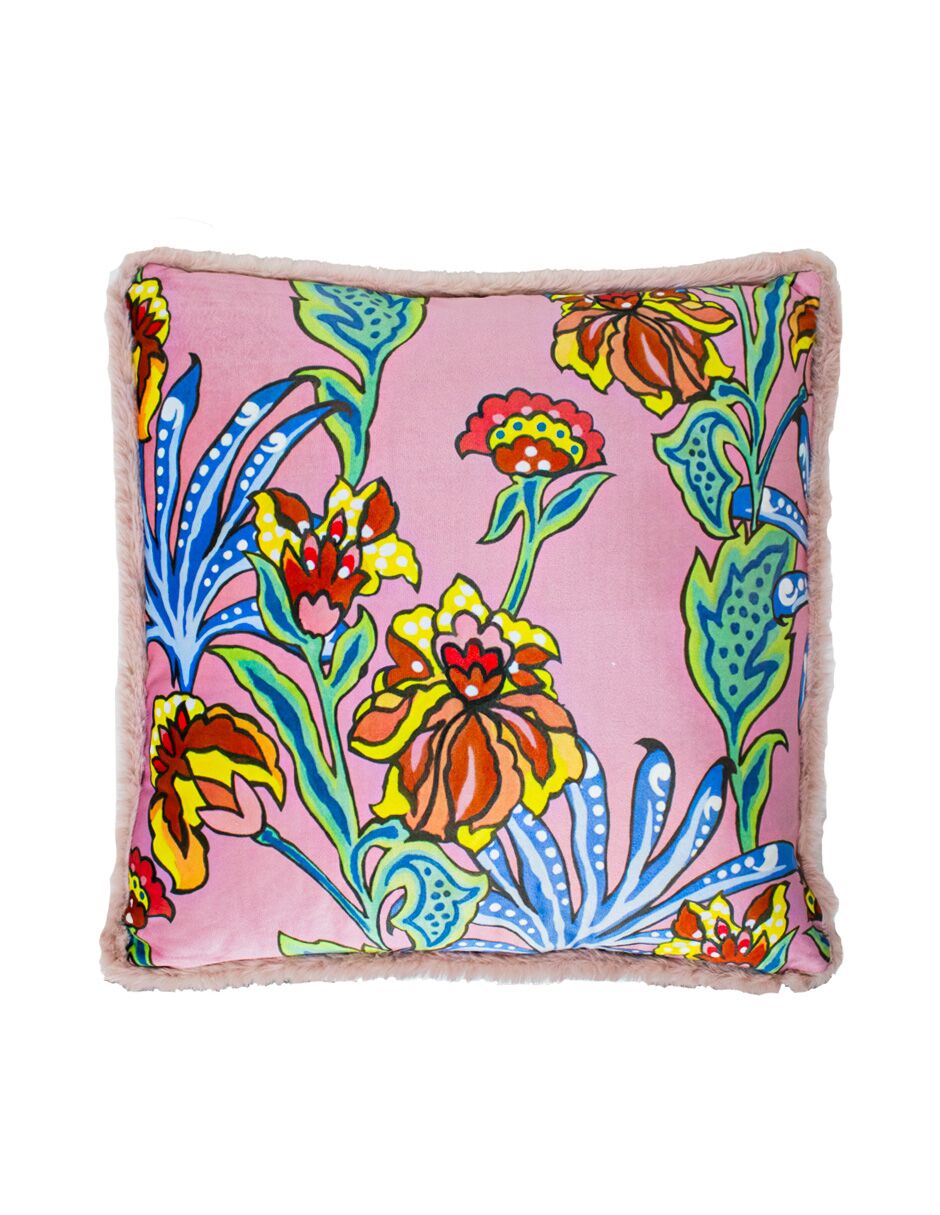 Cojín de terciopelo estampado rosa floreado con orilla de peluche de 45X45cm 100% polyester