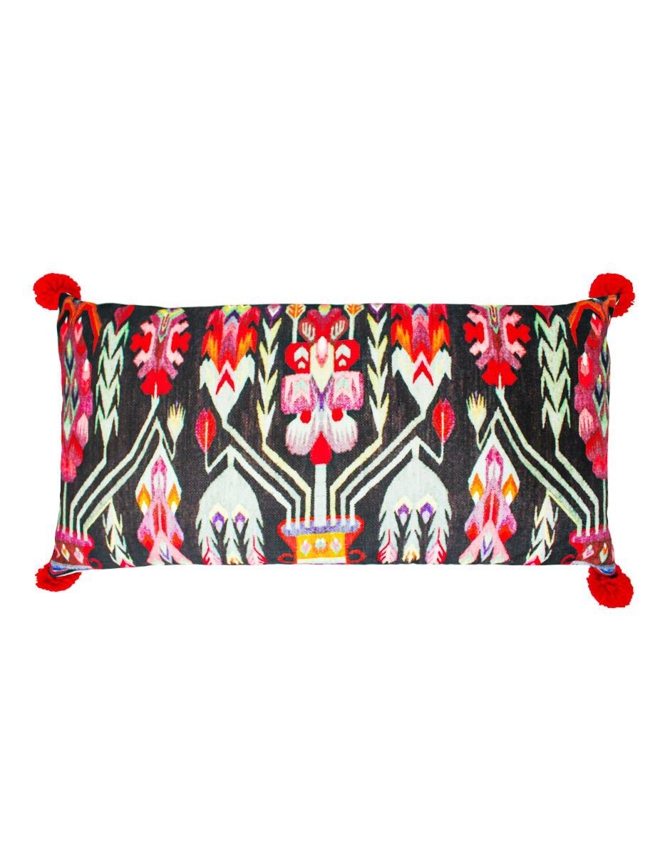 Cojín estampado negro con flores verde rojas con pompones rojos de 30X60cm 100 % Polyester