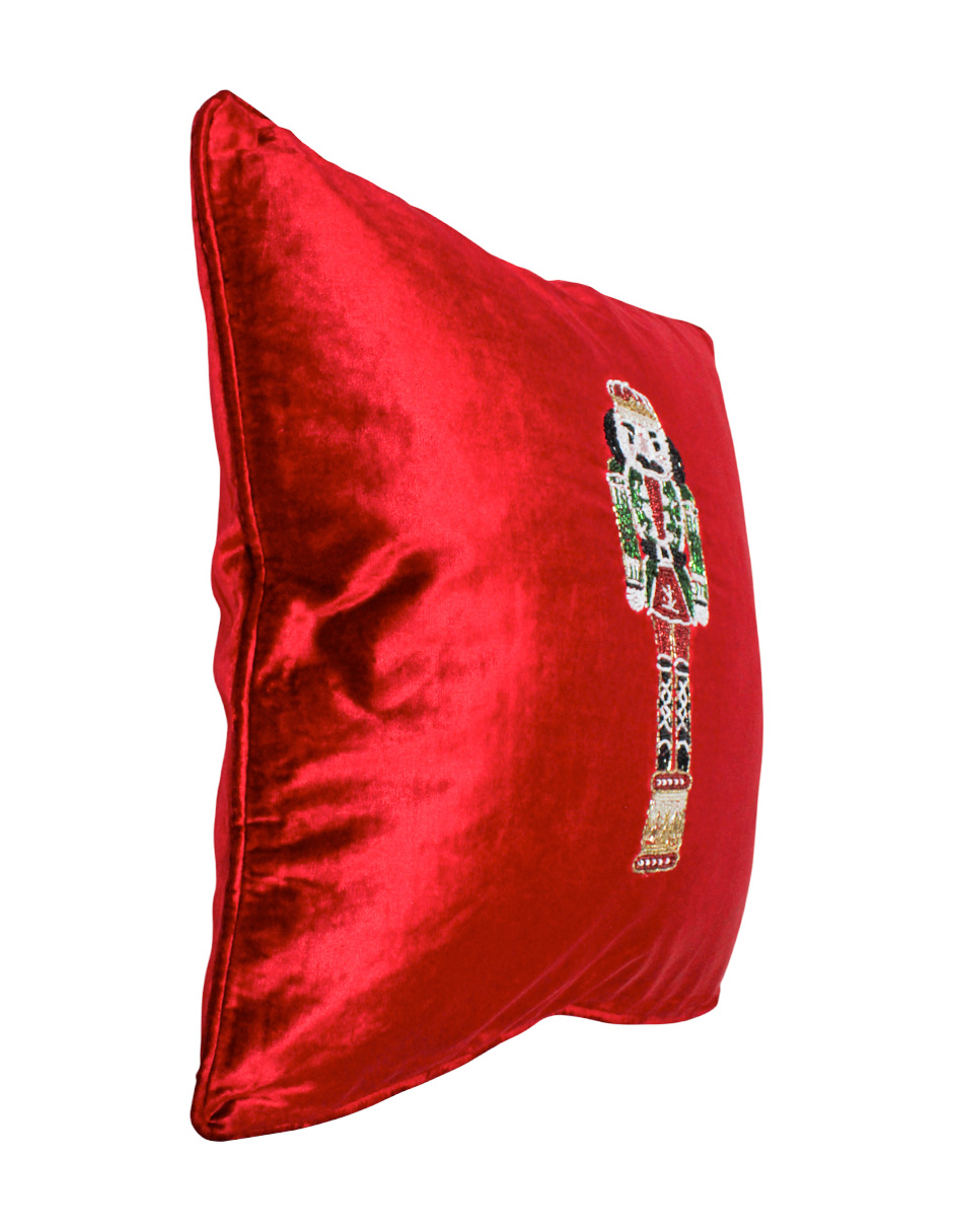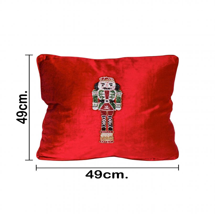 El Cojín Rojo Cascanueces Chaquiras Navidad irradia tradición clásica y alegría festiva. Este Cojín Rojo Cascanueces Chaquiras Navidad no solo es un cojín, sino una pieza que infunde magia y espíritu de la temporada en tu sala. Siente el color vibrante de la Tela Roja, pues el majestuoso bordado de Chaquiras dibuja un elegante Soldado Cascanueces, símbolo de protección y navidad, perfecto para vestir tu sillón con un acento glamuroso y tradicional.