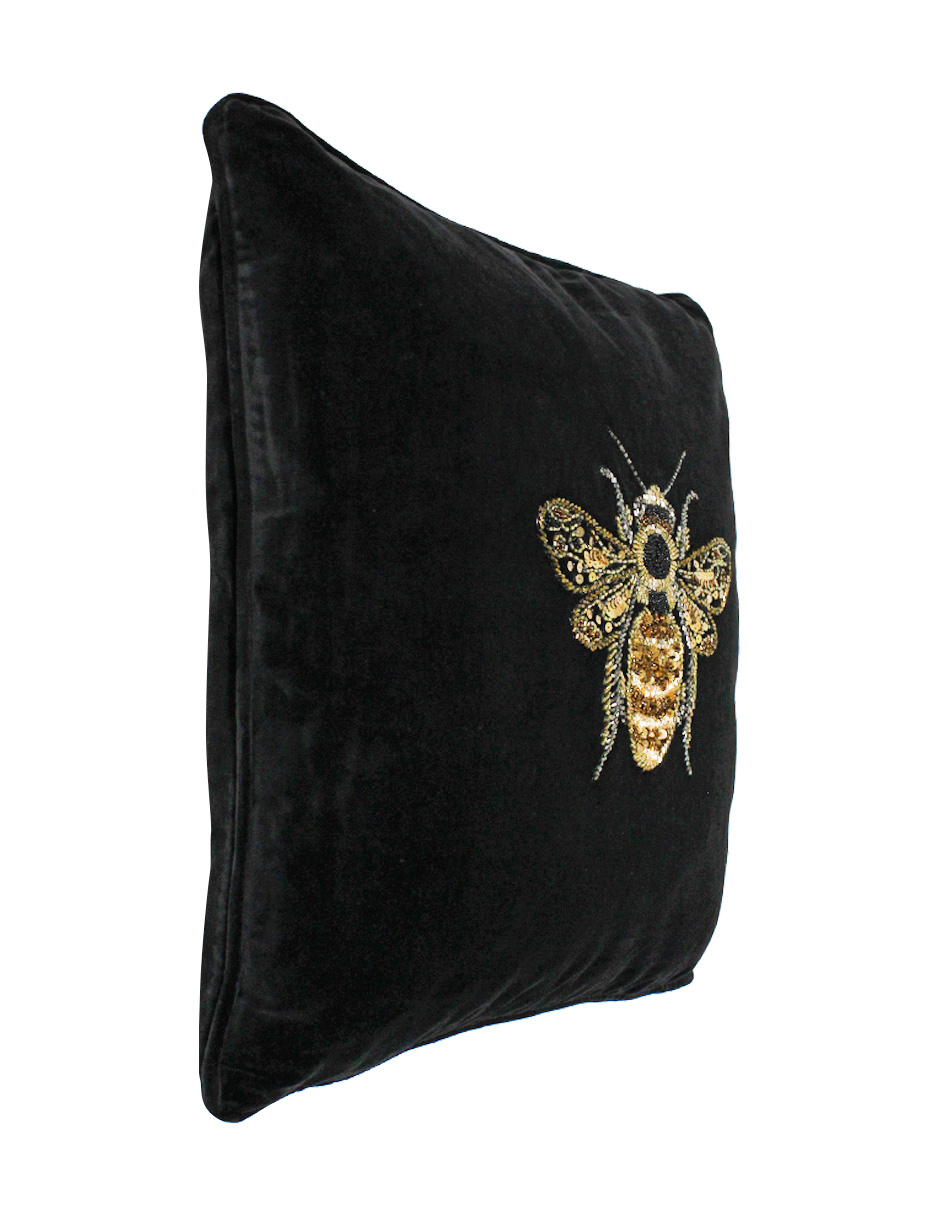 Primeramente, su fondo negro y el brillo metálico es ideal para sofás grises, cheslong blancos o asientos de terciopelo verde esmeralda. Además, el diseño de la Abeja crea un punto focal de lujo que eleva la decoración a un estilo maximalista glamuroso. Te recomendamos utilizar este Cojín Tela Negra Abeja Dorada Chaquiras combinándolo con cojines lisos en blanco, dorado o negro para un estilo consistente. Es el balance perfecto entre la comodidad y la majestuosidad de un diseño artesanal.