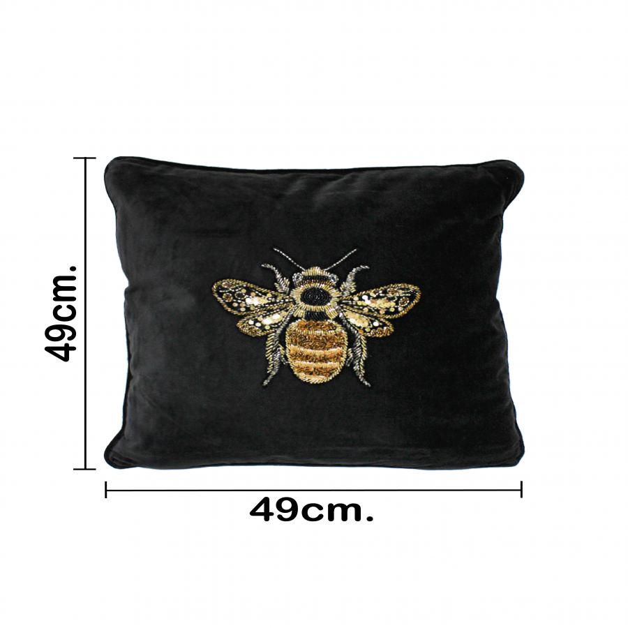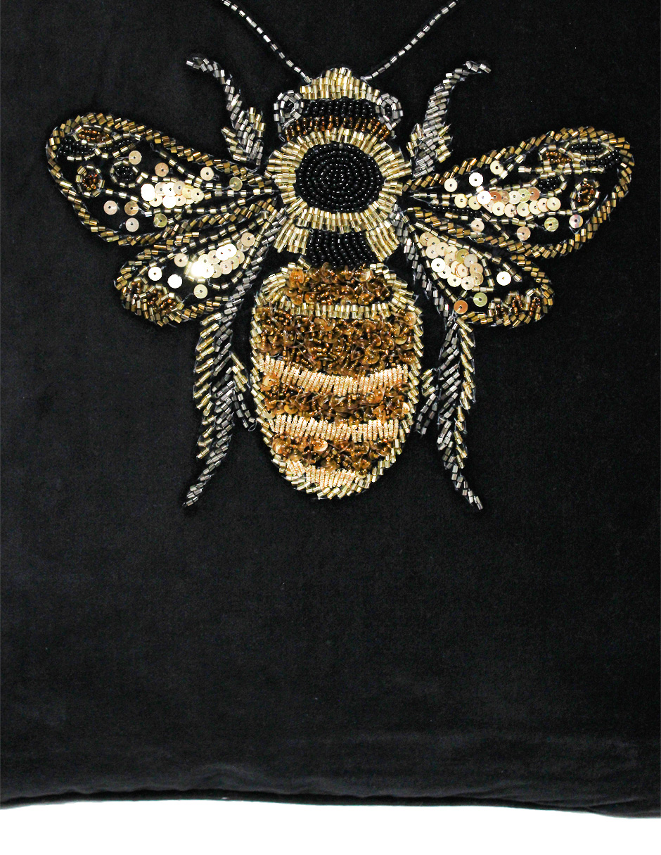 El Cojín Tela Negra Abeja Dorada Chaquiras irradia opulencia cálida y diseño Art Decó. Este Cojín Tela Negra Abeja Dorada Chaquiras no solo es un cojín, sino una pieza que infunde dramatismo y riqueza visual en tu sala. Siente el contraste de la Tela negra, pues el majestuoso bordado de Chaquiras Dorada dibuja una Abeja Joya, símbolo de realeza y riqueza, perfecto para un acento de alto impacto visual.