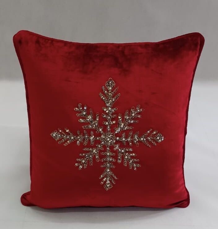 El Cojín Tela Rojo Copo Nieve Chaquiras irradia elegancia clásica y magia invernal. Este Cojín Tela Rojo Copo Nieve Chaquiras no solo es un cojín, sino una pieza que infunde calidez y brillo festivo en tu sala. Siente el color vibrante de la Tela roja, pues el majestuoso bordado de Chaquiras Doradas dibuja un Copo de Nieve, símbolo de belleza y temporada, perfecto para vestir tu sillón con un acento glamuroso y tradicional.