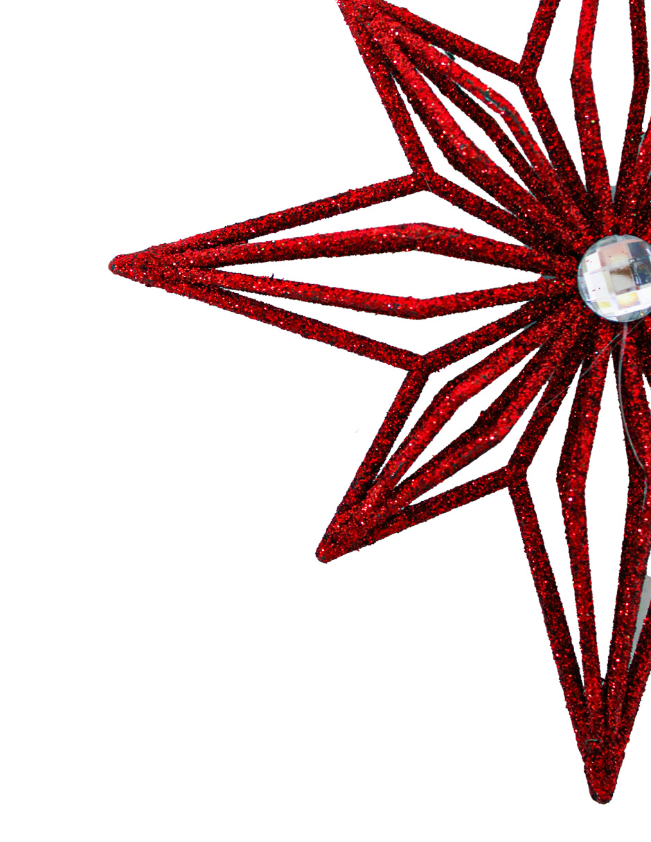 Colgante con forma de estrella con acabado de diamantina roja. Ideal para añadir festividad y brillo a tu decoración.