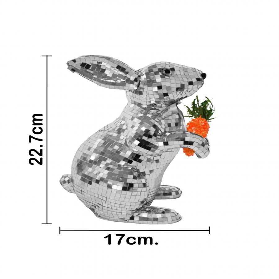 Este concepto decorativo transforma una silueta tradicional en un escenario de alta tecnología visual. Al elegir el Conejo Plateado Disco Ball con Zanahoria, inviertes en una pieza duradera. El producto combina materiales sintéticos con una imitación de mosaico de alta fidelidad. Por otro lado, el contraste entre la forma del conejo y el detalle de la zanahoria ofrece un impacto visual muy equilibrado. Sin duda, será muy atractivo para tus invitados.