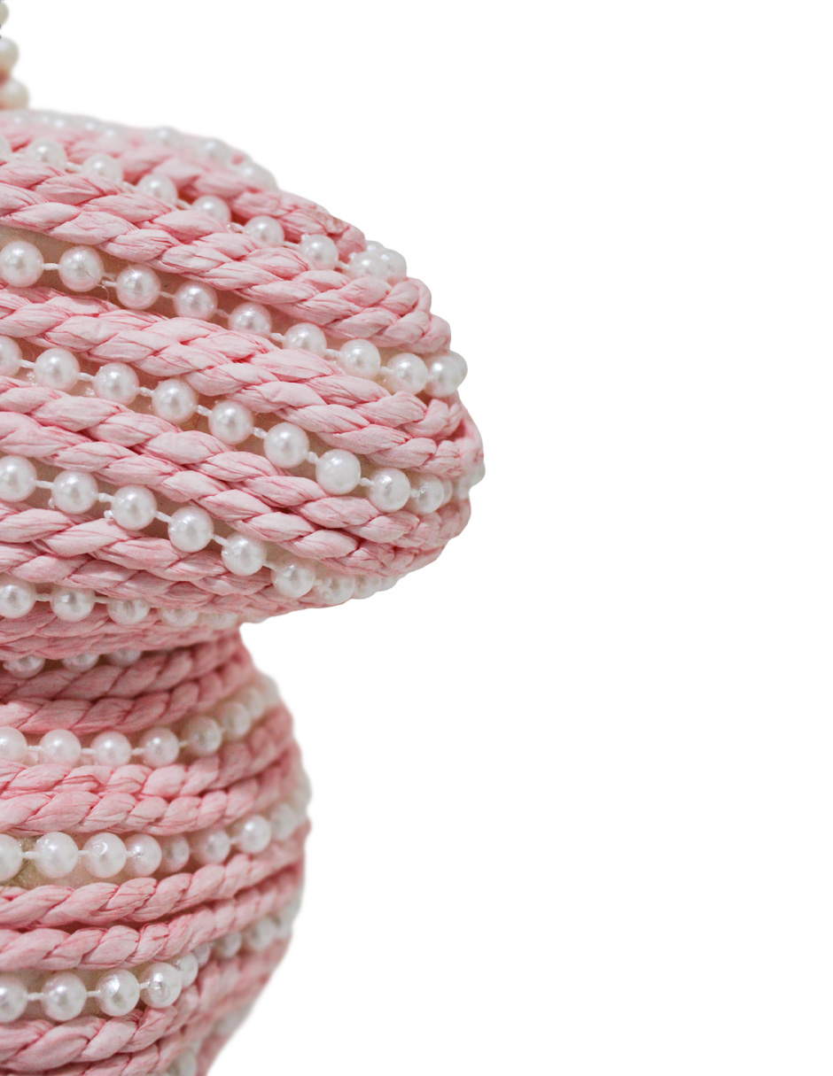 -Materiales: Núcleo de poliestireno expandido, revestimiento de hilo tipo cuerda rosa y aplicaciones de perlas de fantasía.