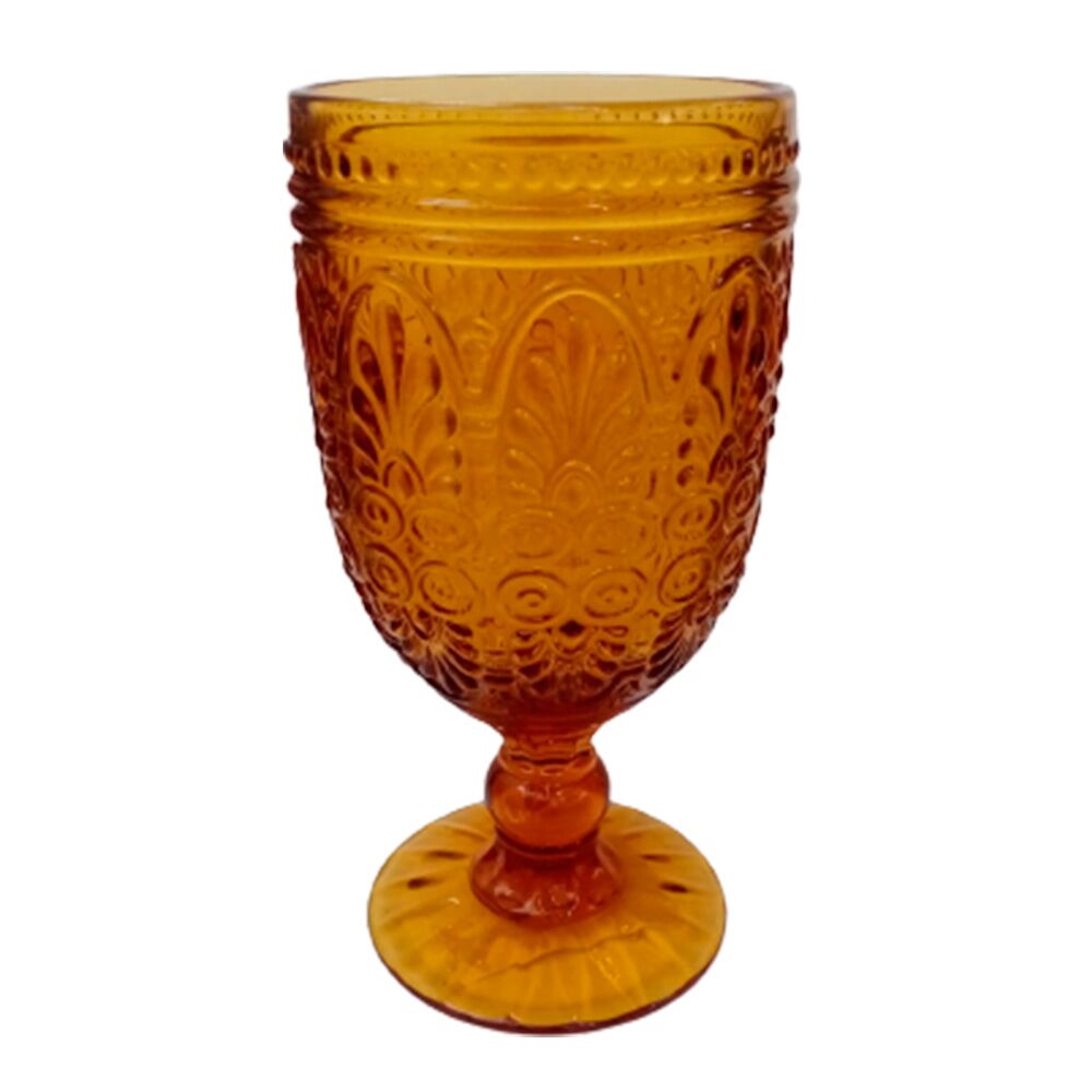 Copa que irradia elegancia y delicadeza atemporal con su prístino color ámbar y un exquisito relieve de abanico que envuelve el cáliz. Este diseño labrado captura la luz, añadiendo una textura sofisticada que evoca un estilo vintage sutil. Fabricada en cristal de alta calidad, es ideal para transformar cualquier bebida en un brindis de distinción. Medidas: 8.5 x 8.5 x 17.5 cm.