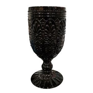 Copa que irradia elegancia y delicadeza atemporal con su prístino color negro y un exquisito relieve de abanico que envuelve el cáliz. Este diseño labrado captura la luz, añadiendo una textura sofisticada que evoca un estilo vintage sutil. Fabricada en cristal de alta calidad, es ideal para transformar cualquier bebida en un brindis de distinción. Medidas: 8 x 8 x 16 cm.