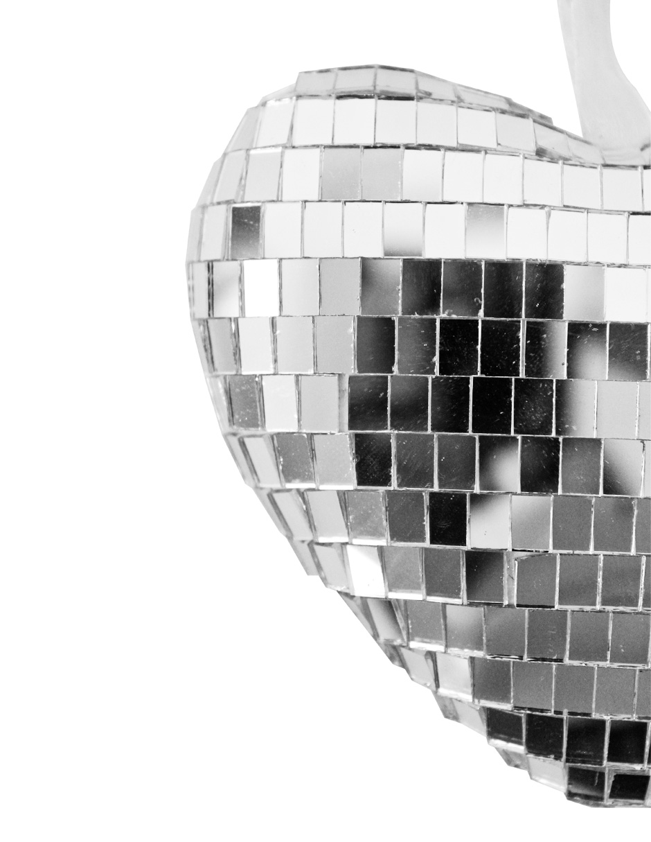 Figura de corazón con un diseño de disco balls. Es perfecta para añadir un toque de brillo y diversión a tu decoración, creando un ambiente de fiesta. Mide 10x11cm.