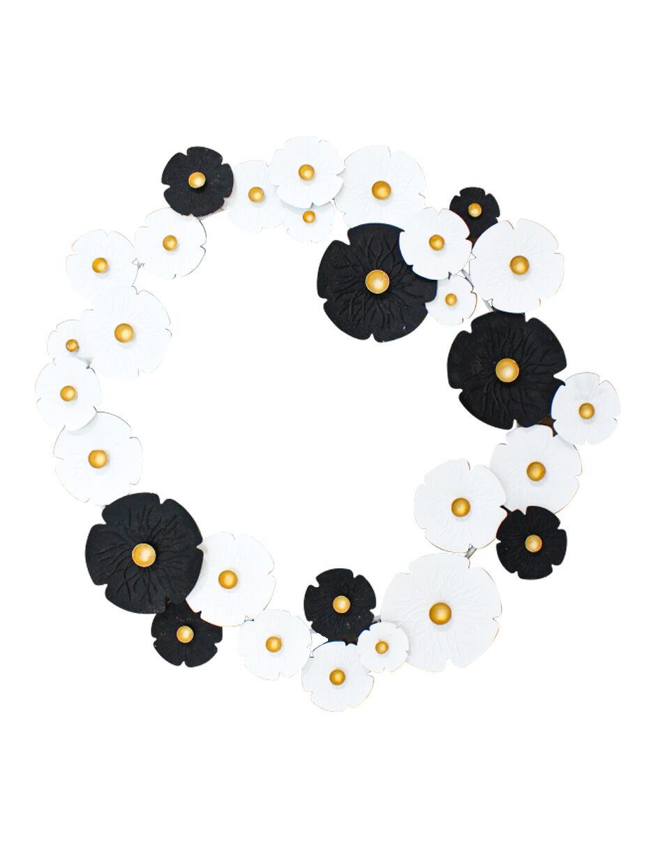 Una audaz corona metálica con un diseño de flores en tonos negro y blanco. Esta pieza es perfecta para quienes buscan un elemento decorativo que combine un estilo rústico y moderno, evocando la belleza de la naturaleza. Material: metal. Medidas: 87.5 x 4.5 x 88cm.
